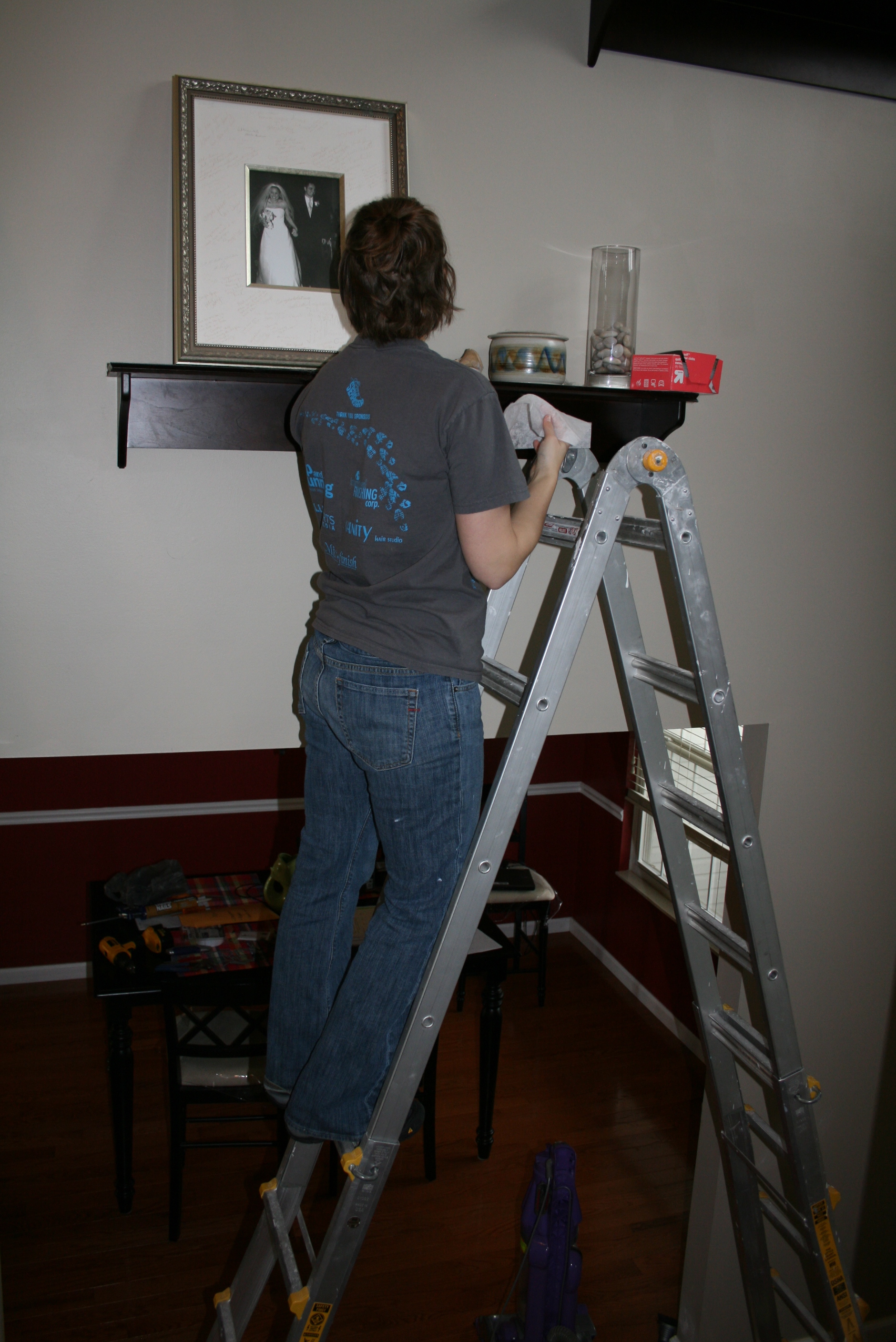I got up on the ladder to dust the shelves in our entryway. Andrew had to do the higher one–I was terrified!