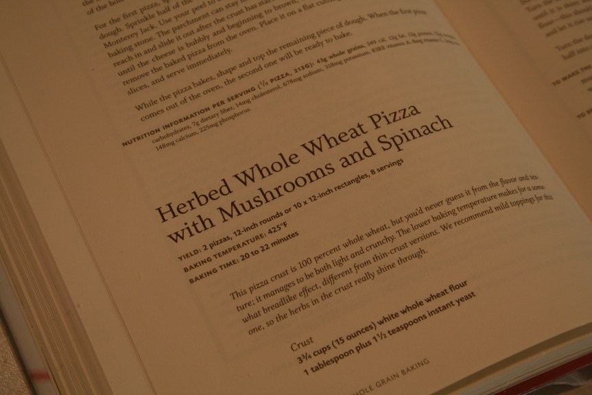 As Heather and I have been eating our way through the pantry and freezer, we decided to make homemade pizza, since we had all the ingredients on-hand. Instead of using the dough recipe that came from my breadmaker (not bad in a pinch, but made with all white flour, which I don’t prefer), I decided to take a peek in my King Arthur Flour Whole Grain Baking cookbook.