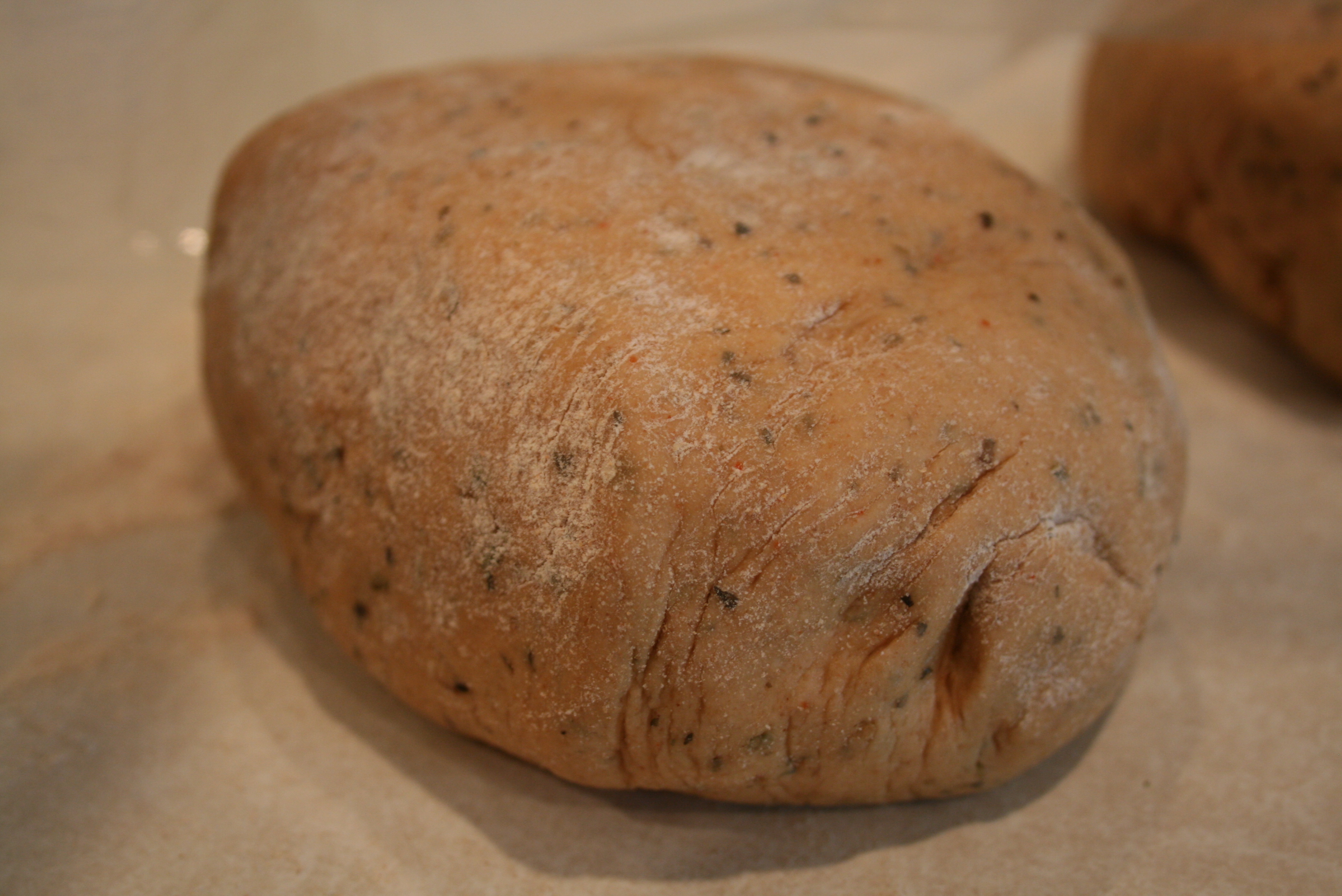 After mixing the herbs in, the dough shrunk way down and was really wet. Then I added the remainder of the flour, and this is what I got: