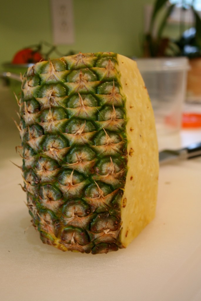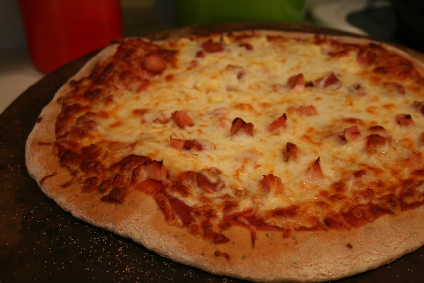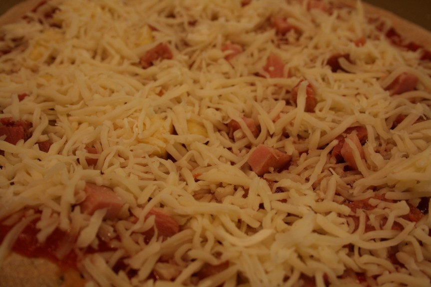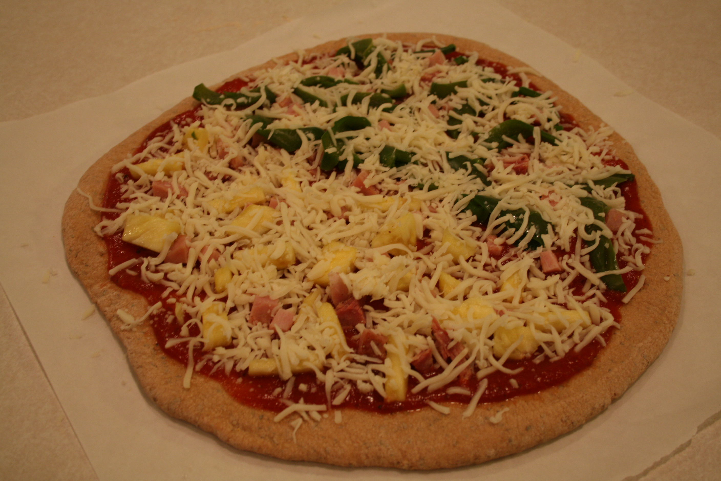 A pineapple (how appropriate), leftover ham that had been frozen after our Easter feast, green peppers and mozzarella cheese.