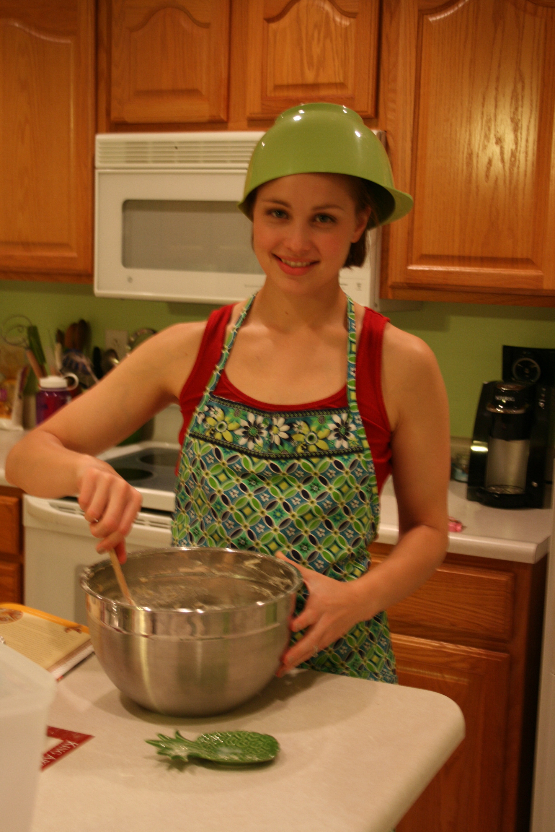 She makes me get a laugh out of life here and there.  (Disclaimer:  this photo is posed.  However, she really did toss the flour bowl on my head after HAND-SPRINKLING eight cups of flour into the larger bowl while I mixed.  This was a miscommunication on my part…)