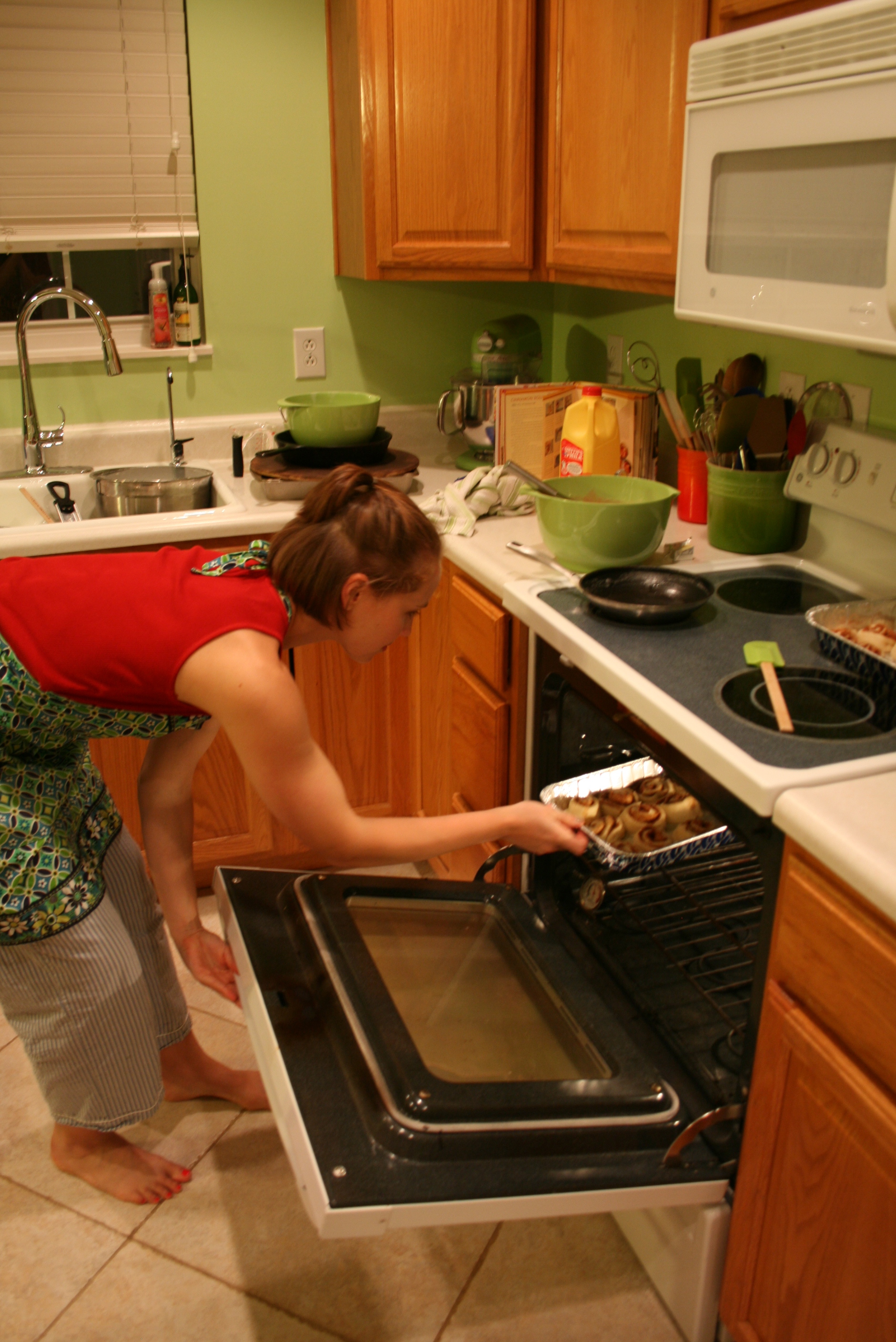Loading cinnamon goodness into the oven.  Again, please take a moment to appreciate all my hard work these last few weeks. I’ve finally lost enough weight to show off the arm and shoulder muscles I earned in the pool all those years ago.  That, and my current lifting routine doesn’t hurt, either.  (Side note:  I’m planning a full “weight-loss” post once I reach my goal, which WAS only 4 pounds away but now might be more like 5 or 6 since Heather keeps pulling out the chips!)