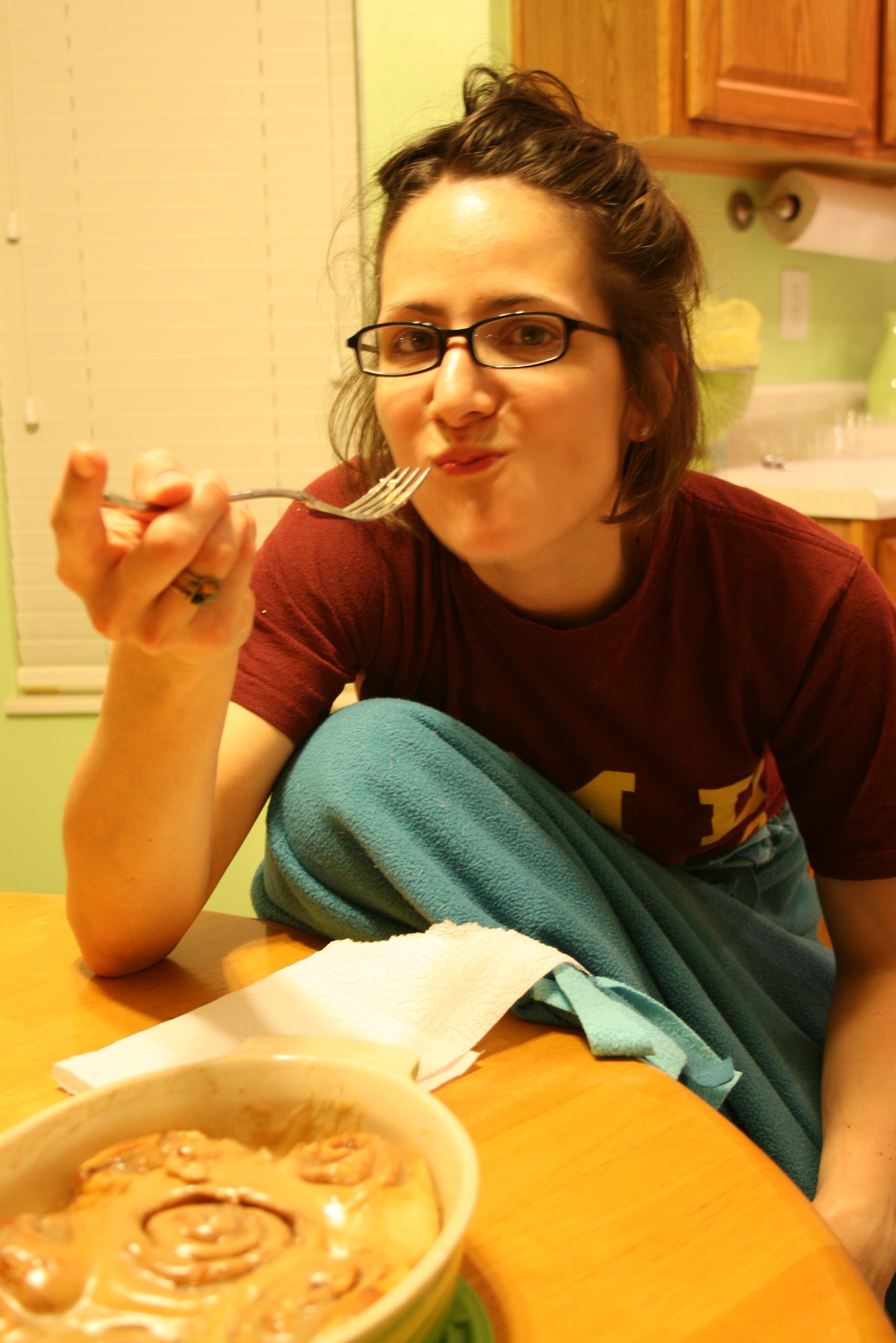 Now those are some well-earned calories!  I have to admit, we both thought the rolls themselves were a bit “bready.”  And we both swear the first time we had them, courtesy of Sara’s first time at house church, they were much “doughier.”  Does that make sense?  How can we make sure our bread comes out doughier next time?  Does anyone know?  Would really appreciate some help on this one…