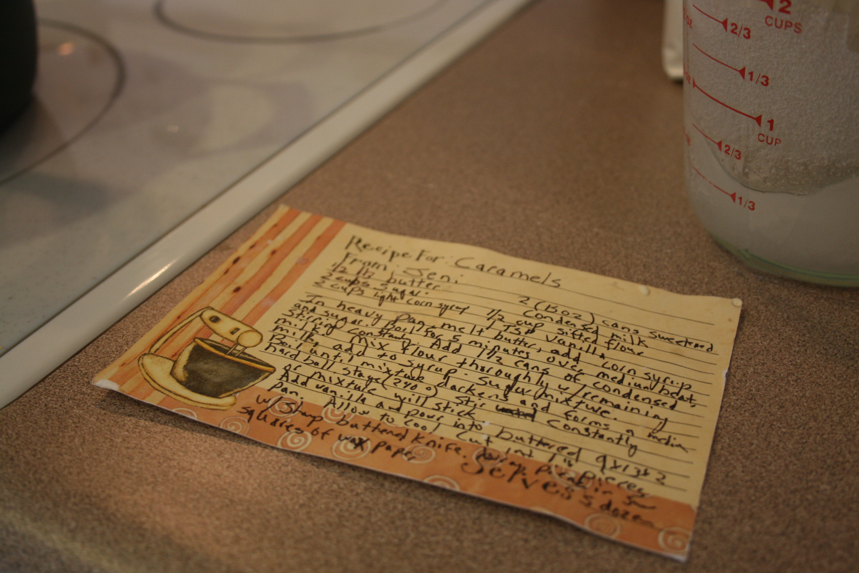 We used Susy’s friend’s grandmother’s recipe for caramels. Barefoot Contessa also has a recipe, so I’ll have to try that one next. (I have this thing with finding the “best” recipe for any given thing… I once made SIX different blueberry muffin recipes one Saturday morning just to figure out which was the best. Results in a nutshell: the recipe I’d been making for the last few years came in dead last, Martha’s came in first [of course her’s would]. Andrew did document that morning in pictures, so perhaps one of these days I’ll share them with you all!)