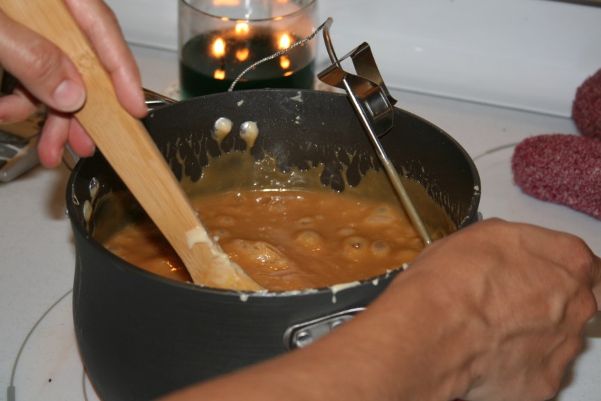 Apparently, you test “done-ness” by spooning a tiny bit into a glass of ice water and tasting it. It should be “hard ball,” or relatively solid. We must have tested it five times before it was ready…