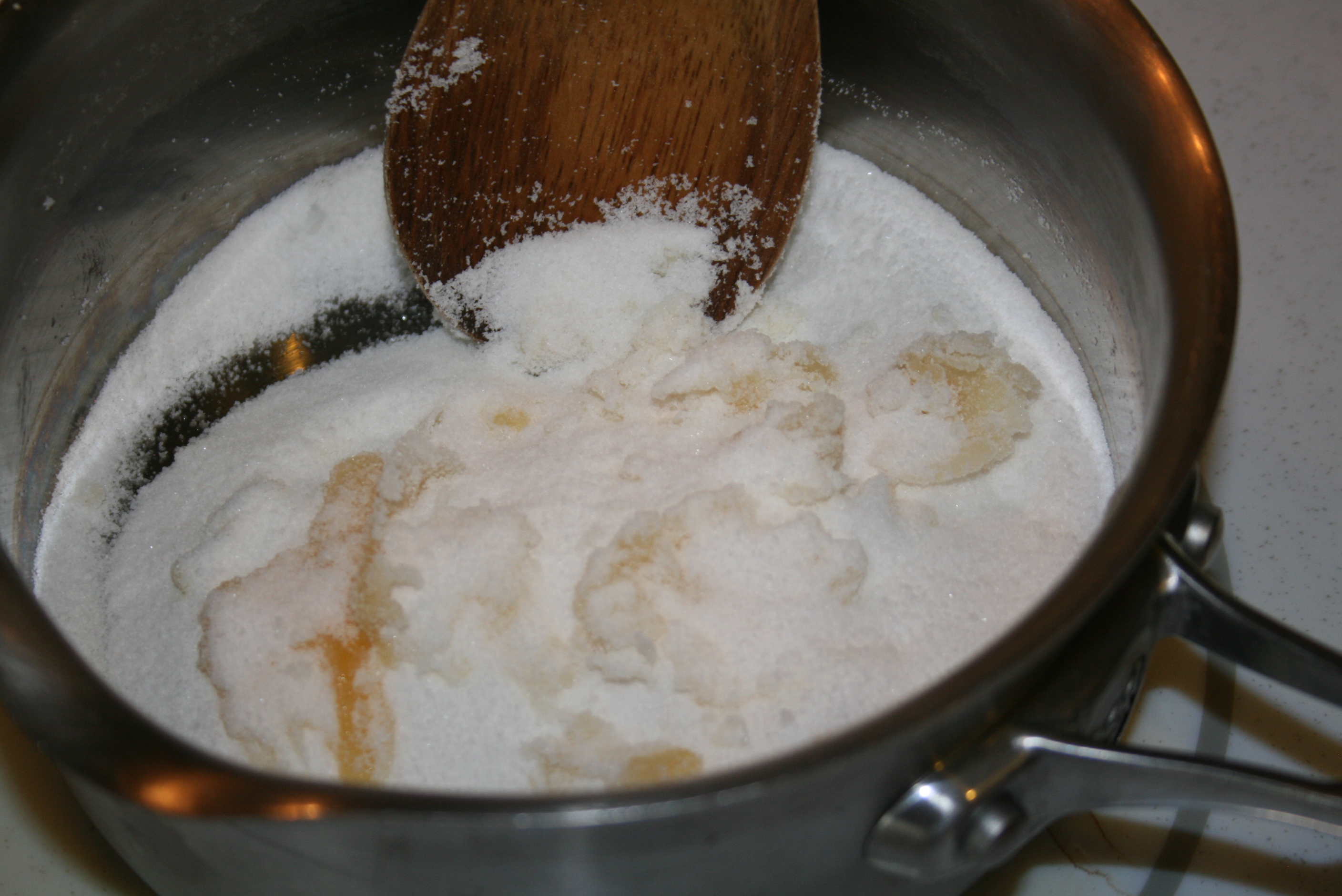 The sugar will start to melt into what look like clumps. Stir a little, but not too much! (Susy said not to.)