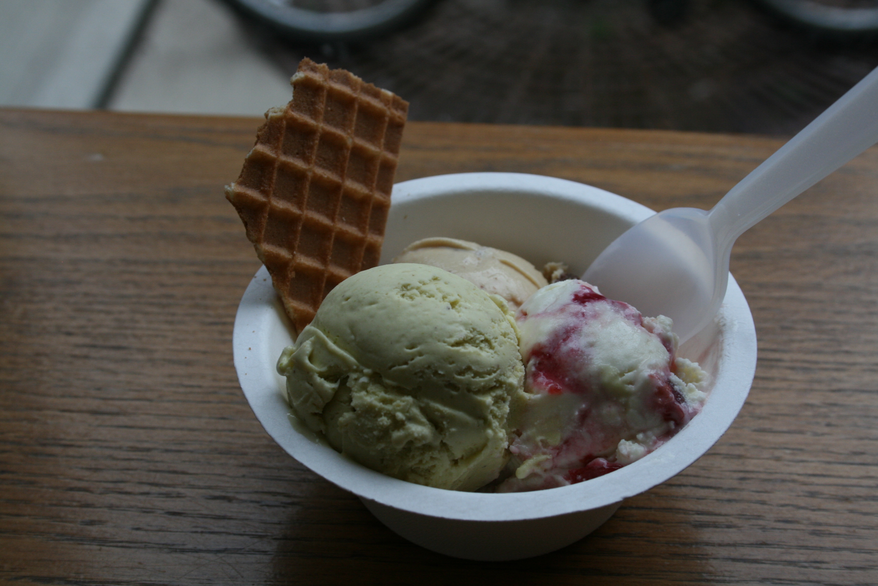 I got Bourbon Buttered Pecan, Sour Cherries and Goat Cheese, and Pistachio and Honey–YUM. The Pistachio and Honey was awesome–I saved it for last. It was slightly salty, slightly sweet and a little nutty.