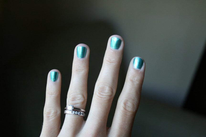 My fingers are currently sporting OPI’s “Mermaid to Order.” I found it at Sephora a couple summers ago and bought it immediately. I love teal. Pretty much anything in teal makes my heart jump–clothes, shoes, makeup, kitchen gear, home furnishings… (Specific shades of blue and green have a similar effect as well.)
