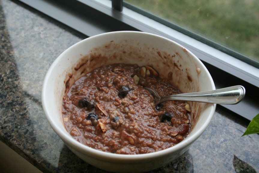 I used instant oats (I know, I know, not my favorite, but I have a bag of them here in the hotel and I want to use them up!), half a banana, a few frozen cherries, 1 tbsp chocolate chips, 1/2 tbsp flaxseed meal, slivered almonds and a splash of milk.