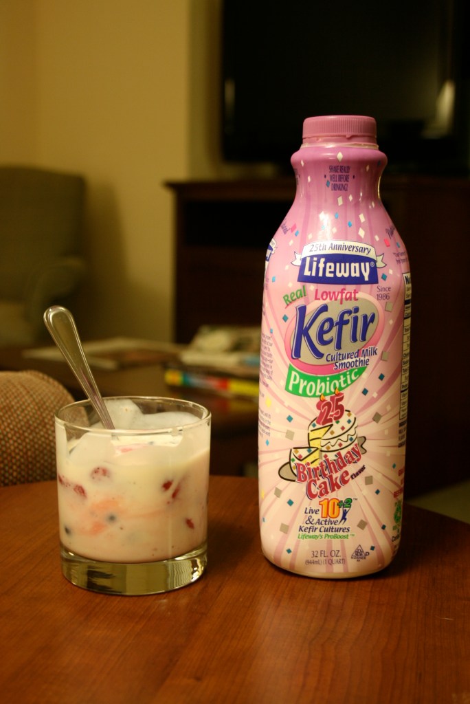 I told you I bought the “Birthday Cake” flavored Kefir on an impulse last time I went to Wegmans. I bought Kefir all the time in Ohio; both for Andrew and myself. His favorite is strawberry and mine, is, well, all of them. I’m bummed that the bottles are a WHOLE DOLLAR more here ($3.49 vs $2.49 in Ohio) but there is way more selection (hello peach!).