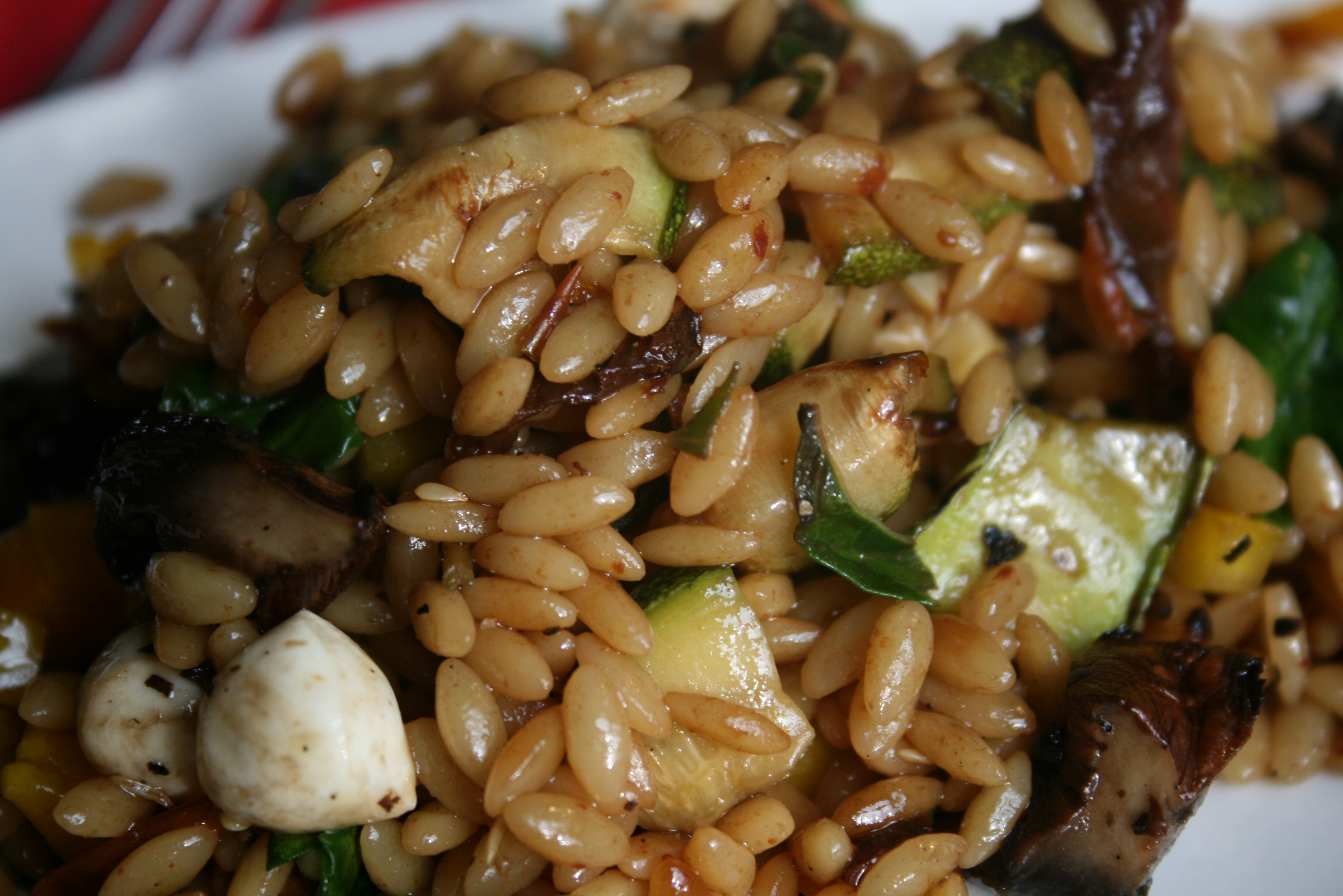 I had about 5 ounces of orzo hanging around, so I found a recipe in my Foster’s Market cookbook for a dish with grilled veggies, sun-dried tomatoes, mozzarella and greens. It was lightly dressed with olive oil, lemon juice and balsamic vinegar. Because I love my husband, I kept the grilled portobello mushrooms and mozzarella on the side and only added them to my half.