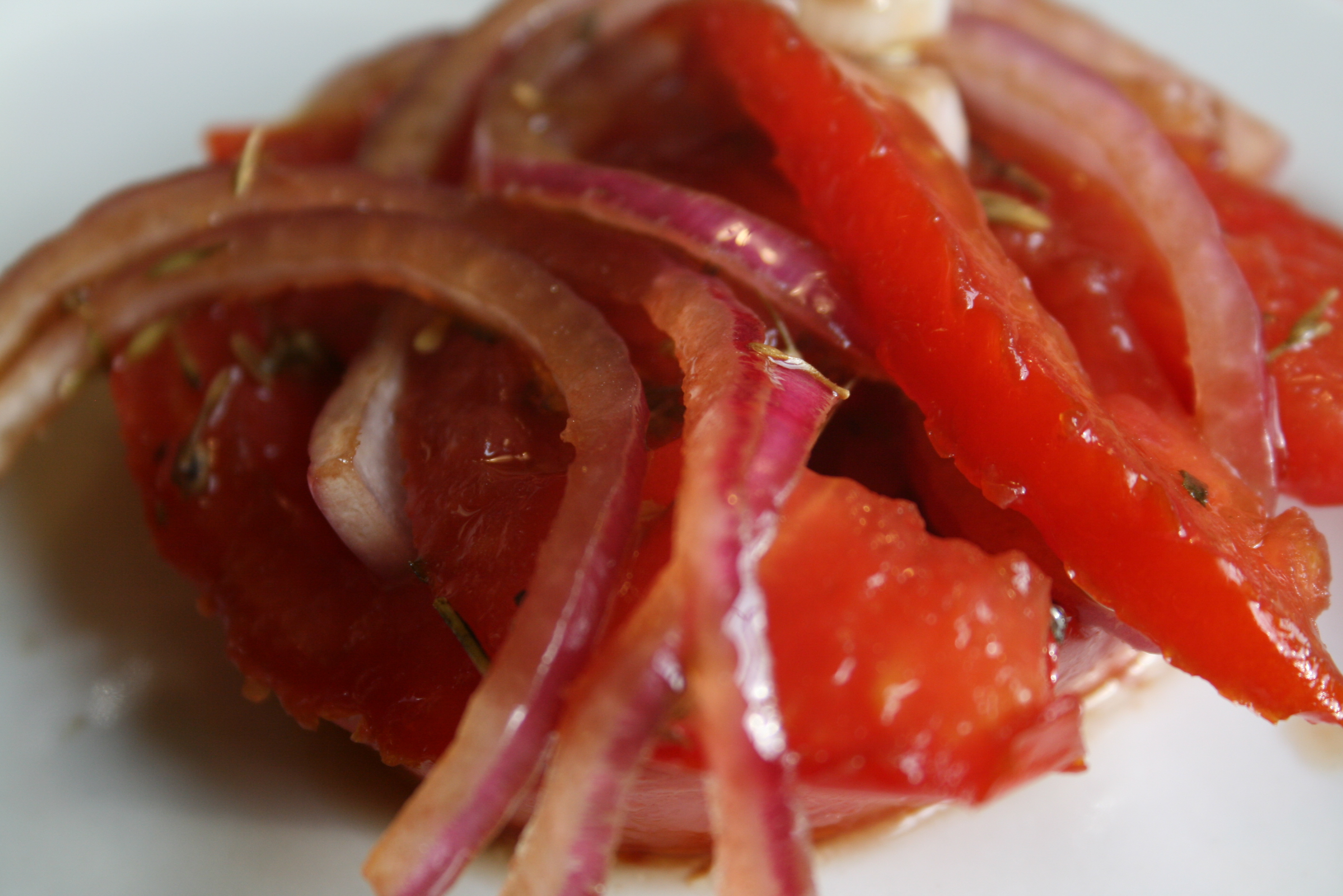 I threw together some balsamic vinegar and olive oil-marinated tomatoes and onions. Growing up, my mom would thickly slice tomatoes and Vidalia onions and bathe them in a mixture of olive oil and balsamic vinegar. Ah, the memories. I don’t have any shallow dishes here, and all I had were red onions, so I went with what I had.