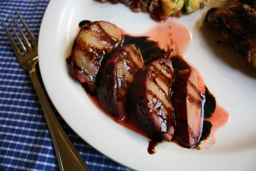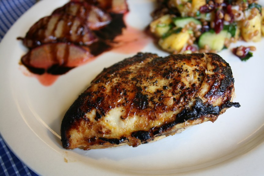 Tonight’s dinner wasn’t the most amazing thing ever, but I thought the wheat berry salad was fantastic. I sauteed a sliced plum in some extra marinade from the chicken and white wine, then swirled some balsamic syrup on top. They came out mushy and with a bit too much bite. Oh well, there is always next time.