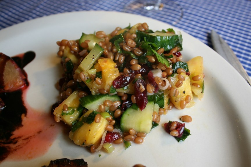 The star of the meal: Anna Pump’s wheat berry salad with pineapple, cucumber and mint. Loved it! It was incredibly fresh and light. The only other wheat berry salad I’ve made before is Ina’s, and it’s more of a veggie and balsamic mix, so a totally different flavor than what we ate tonight. I cut up a fresh pineapple for this (the only way to go here), and the salad also includes parsley, dried cranberries and scallions. The only dressing is lemon juice and olive oil, and plenty of salt and pepper.