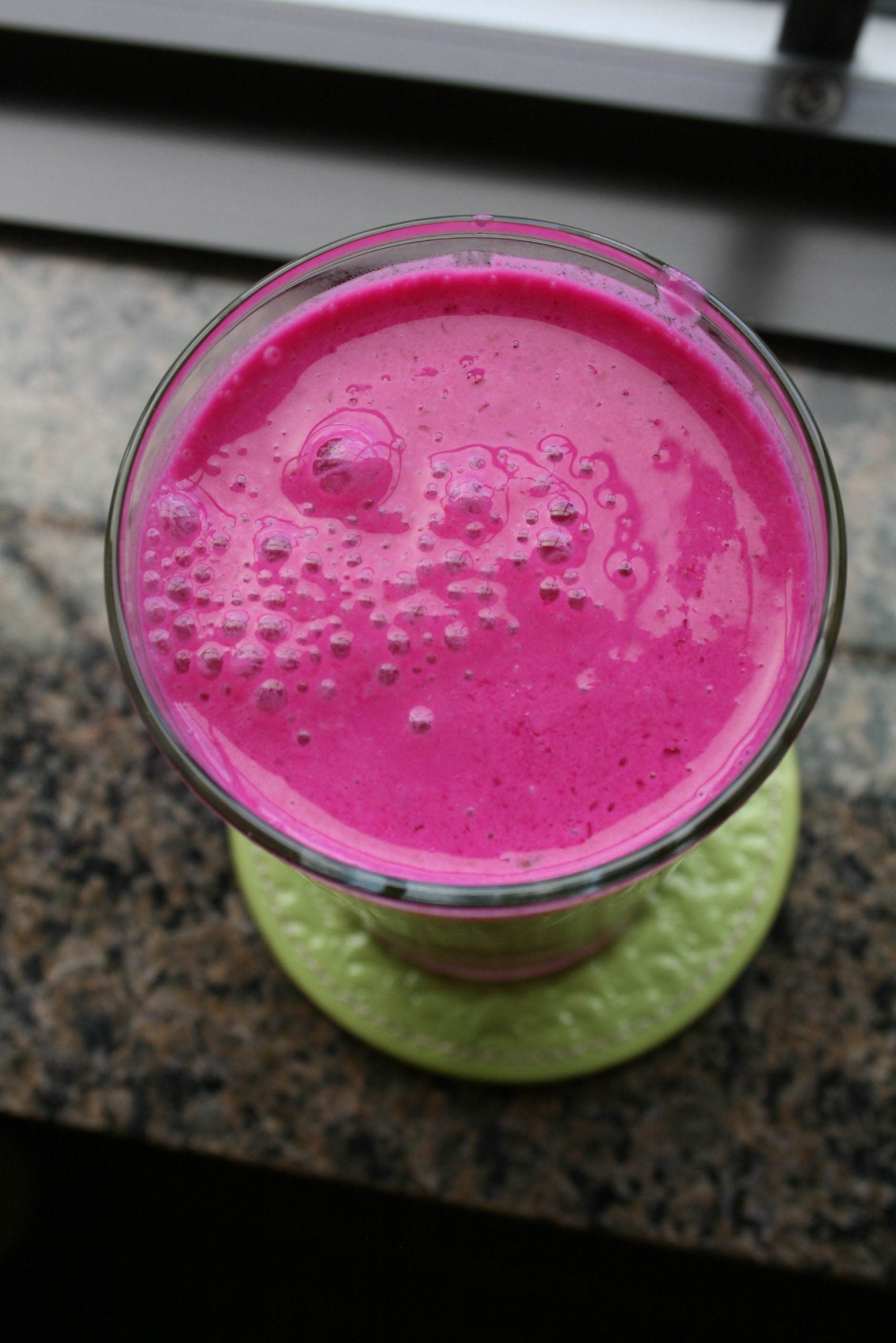 After my run I used up the LAST of the beet puree in a “Beet-iful Beet” smoothie. I used about 1.75 ounces (2 tbsp) puree, 3/4 C plain lowfat yogurt, 1 tbsp honey and some cinnamon. Still pretty beet-y, but it went down well. It will certainly fill me up until lunch! This won’t be the last time I use beets, but I doubt I’ll be doing many more smoothies with them. I don’t think I’ve tried roasted beets, and the beet pancakes I made once were pretty tasty as well.