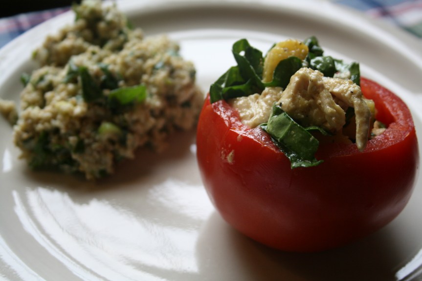 The beefsteak tomatoes cost me an arm and a leg ($3.50 for 2!), but it was worth it to hear Andrew approve. The filling was a mix of diced, cooked chicken, pineapple and spinach, dressed with olive oil and dijon mustard. It was a cinch to whip up and you could easily do just about anything with this…switch out the filling components and use ranch dressing or a balsamic vinaigrette, or you could always stuff a pepper.