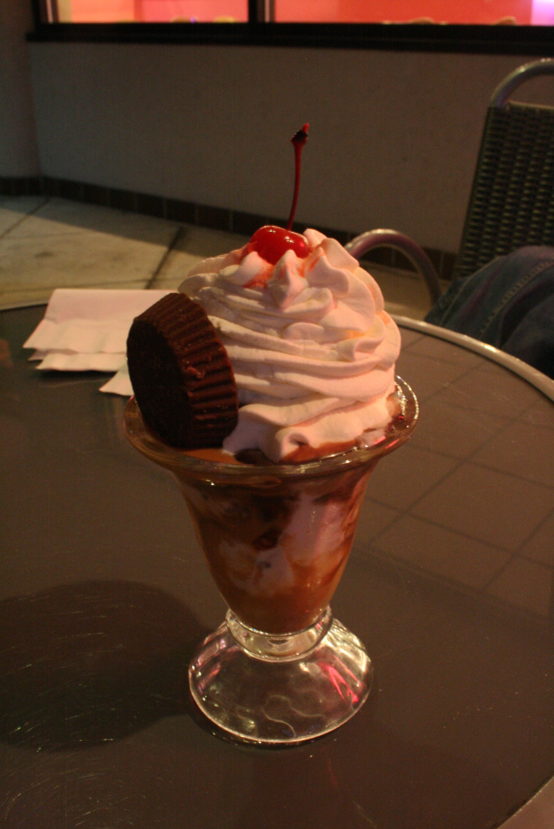 I chose the Reese’s Cup (jr.) Sundae. Seriously, this is just the JUNIOR. Can you imagine how big the regular would be??? It was filled with both hot fudge and peanut butter topping, peanut butter ice cream, whipped cream, a cherry and a Reese’s Cup. Can you tell I like peanut butter? I do. And I can’t tell you how long it’s been since I’ve had a Reese’s Cup. A LONG time.