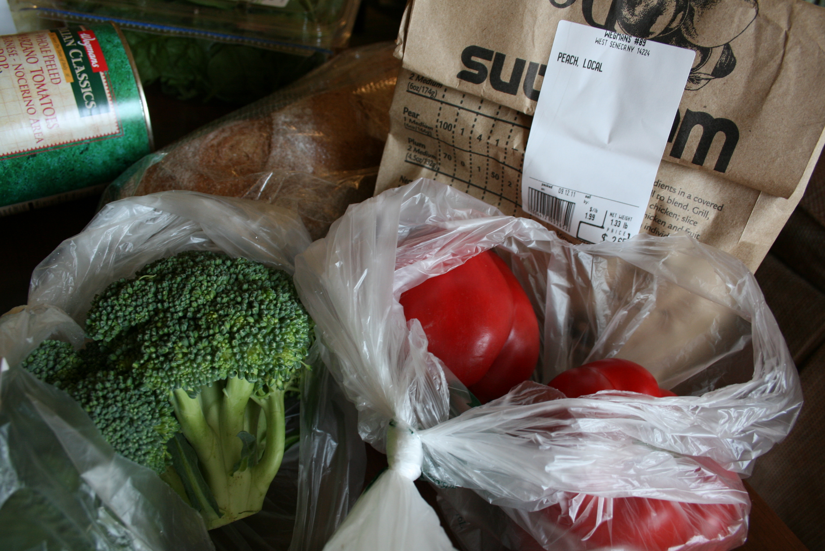 Local broccoli (does it not look amazing?!), red bell peppers and peaches. I bought the broccoli and peaches from the same farms (at Wegmans) last week and was SO IMPRESSED with both of them.