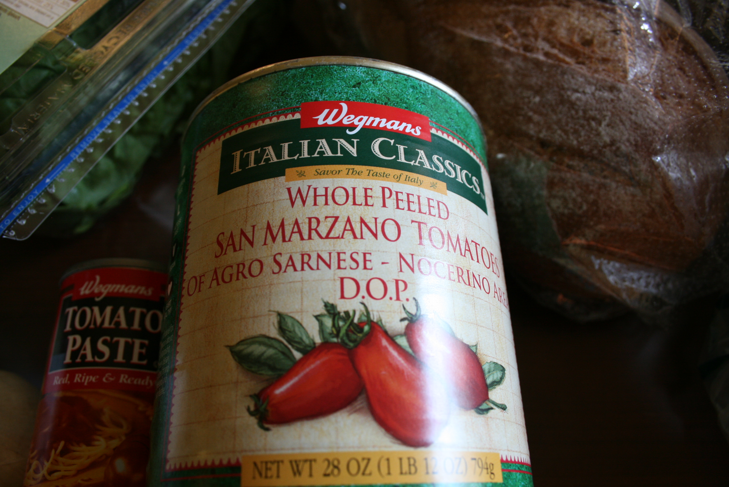 I sprang for the “San Marzano” tomatoes for Ina’s recipe. A lot of the tomato recipes I have call for “San Marzano” tomatoes and I’ve always wanted to try them, but never wanted to pay more. I was in a mood yesterday and just went for it! I did end up with the Wegmans brand, cheaper by 30 cents, but at $3.69 for ONE 28-ounce can, it was still an arm and a leg. The deal with the tomatoes is that they’re grown in a special part of Italy (near the water I think) and allowed to ripen for longer than all the other tomatoes, so they’re deeper, and darker in color and richer in nutrients and flavor. (See Andrew? I bet you didn’t think I knew all that stuff about them.) The verdict: While I’m sure they are a little better, I probably won’t choose to spend extra dollars on canned tomatoes–I’d rather spend it on local/organic food!
