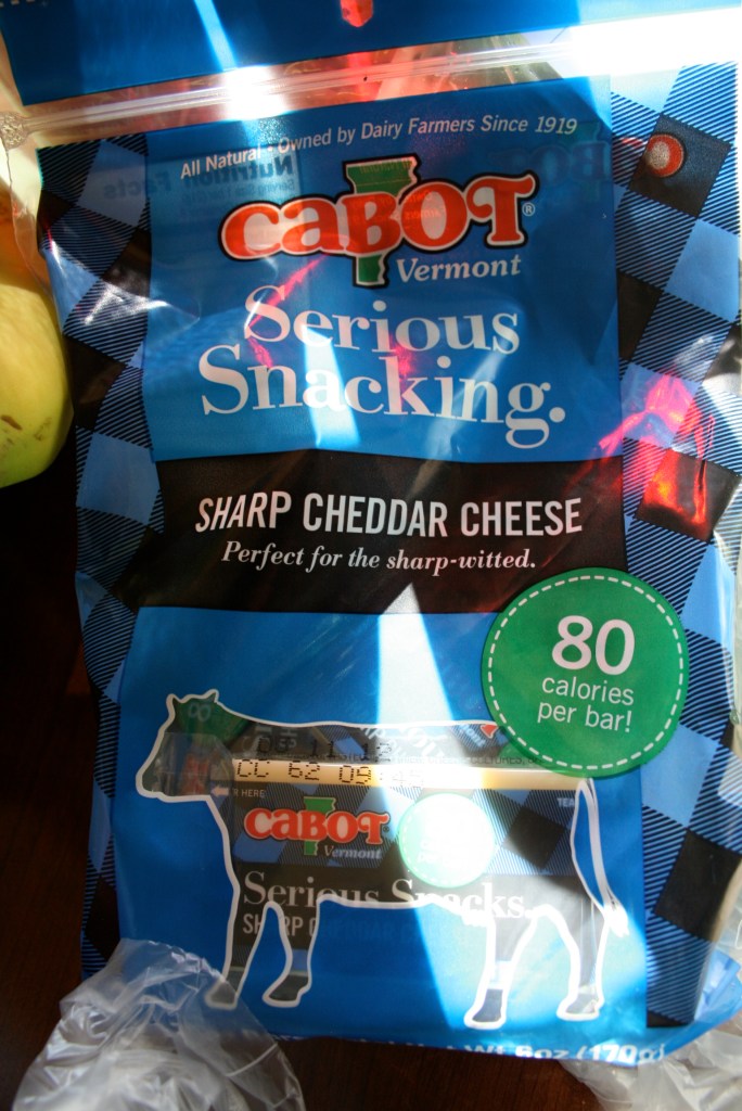 I keep cheese sticks around 24/7 for snacks. I love to pair one with an apple for between classes at school or after the gym. I usually buy mozzarella cheese sticks, but this time I wanted to get organic ones. Again, I eat A LOT of cheese sticks, so it would be worth it to buy organic. However, I couldn’t find any (which surprised me, maybe I was looking in the wrong place?), so I ended up with Cabot brand sharp cheddar sticks. They were actually a bit cheaper (although the package was smaller, 8 vs. 12) and I thought it would be nice to change it up a little. I really like Cabot brand–it’s a co-op (!) owned by dairy farmers and all natural. Not to mention they’ve won tons of food awards for their cheeses… I bought their regular yellow cheddar last week in the sliced version for sandwiches. No processed cheese “food” for this girl!