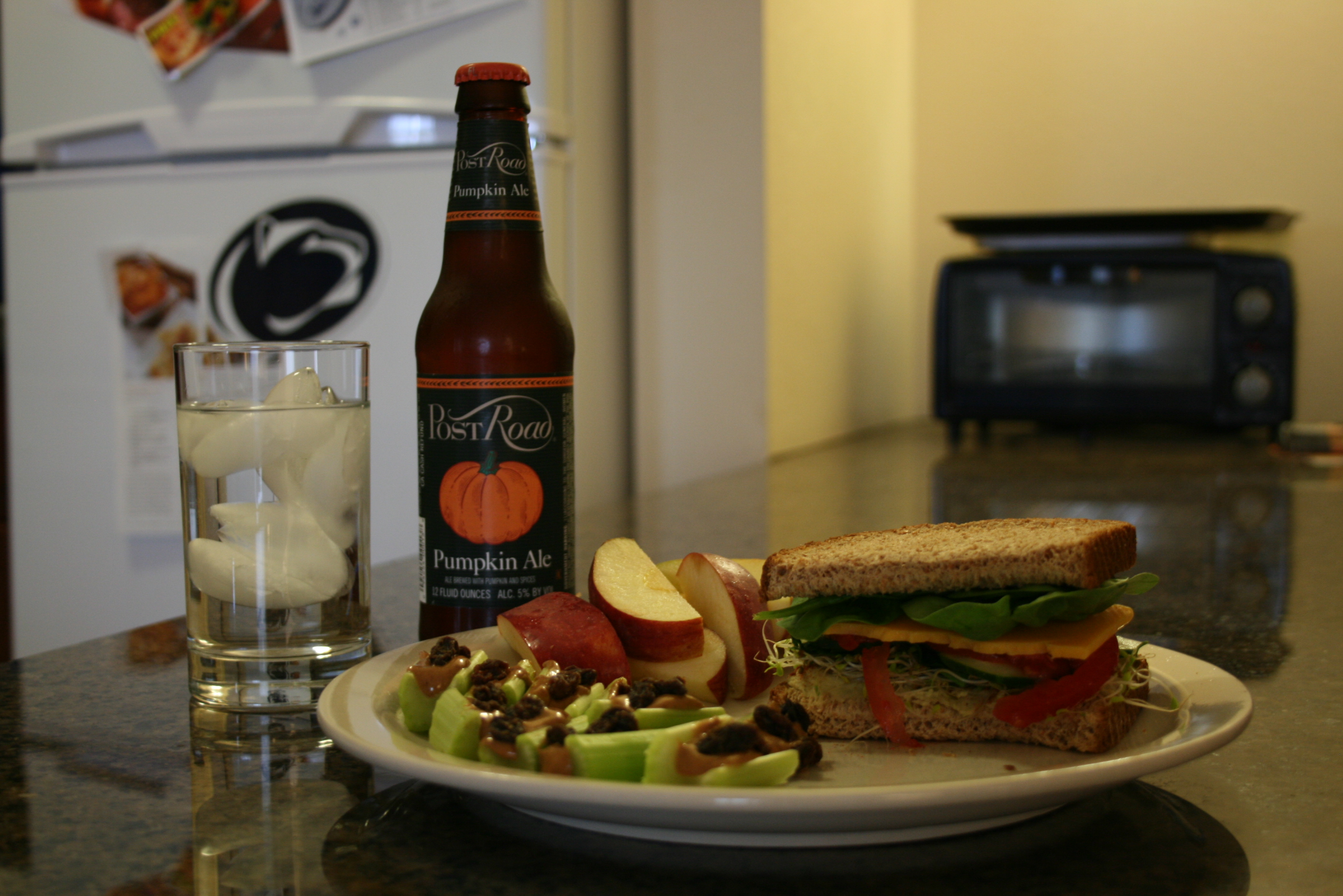 As I said, I’m into pumpkin beer right now. I really do want to find a go-to pumpkin beer/ale that I KNOW I like and can look forward to every fall. I’ve tried Blue Moon’s variety and don’t really like it. I know I like the Buffalo Bills Brewery’s version (their Orange Blossom Cream Ale is awesome, too!). (Side note: Buffalo Bills Brewery is in CALIFORNIA. Not sure why…can’t find anything online that explains their name. Grrr.) Last time we were at Wegmans, I decided to give Post Road’s brew a try, which is what I had today. Don’t really like it so much. It’s really “hoppy” and not pumpkin-y at all.