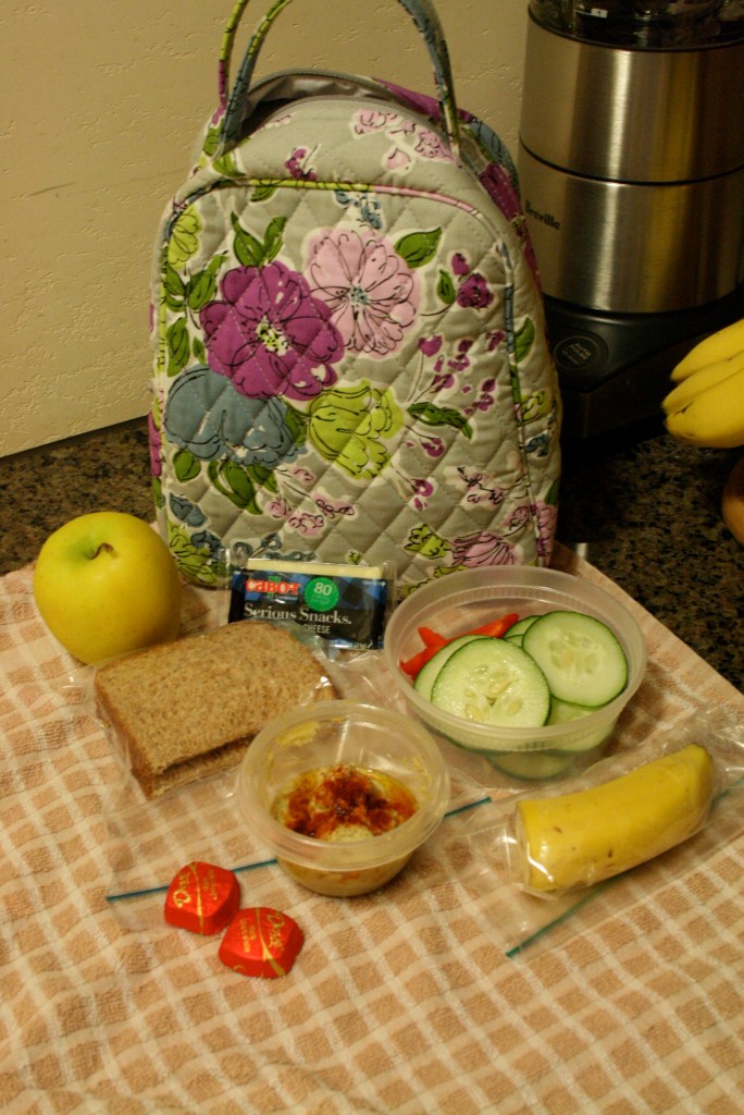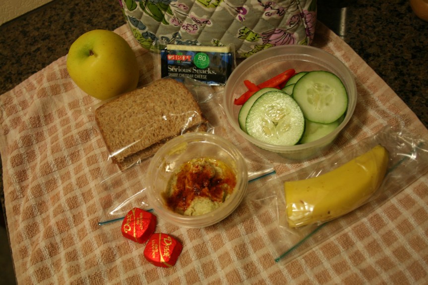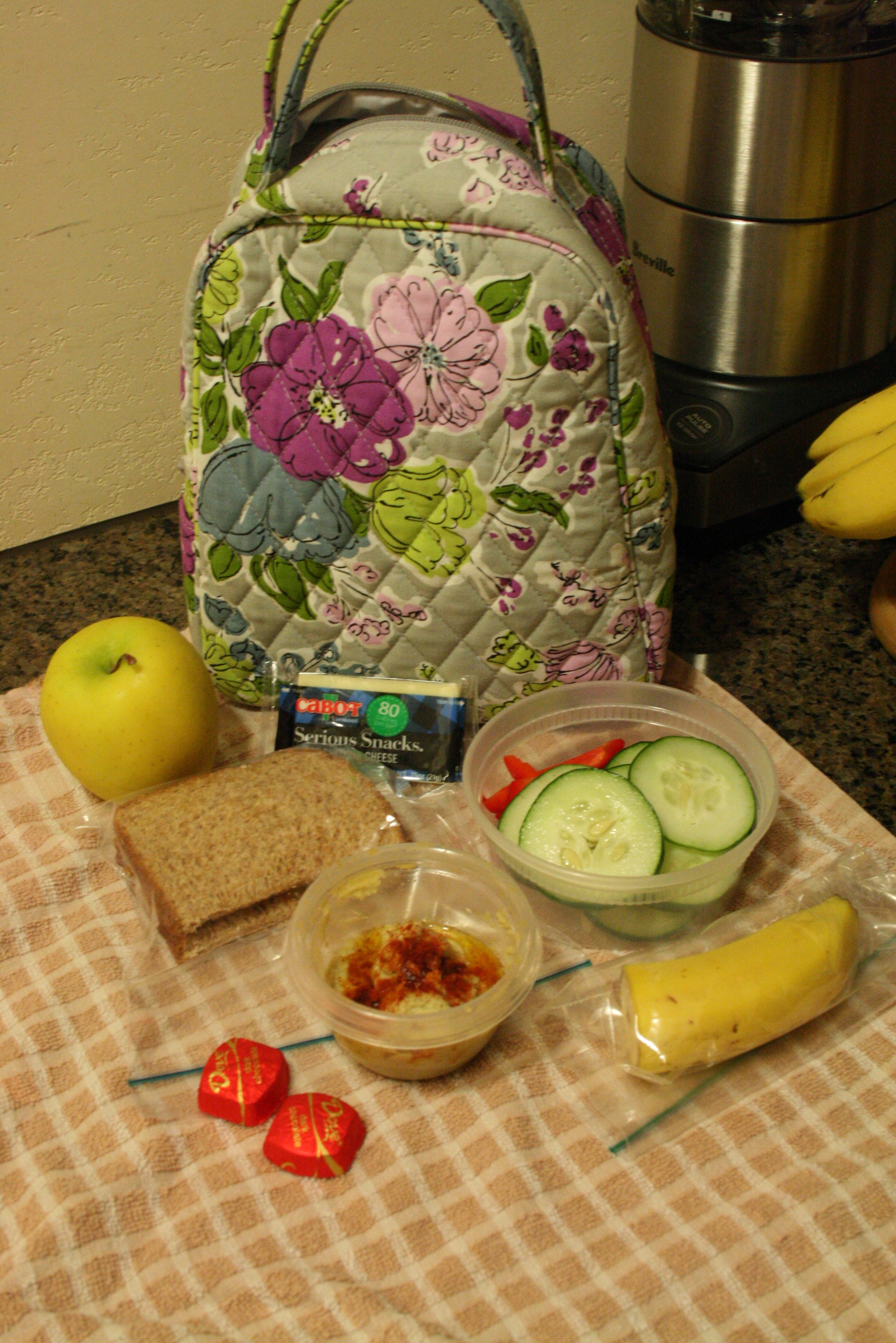 An apple, half a sandwich (with natural peanut butter), veggies, homemade hummus, half a banana (the other half is currently mashed and mixed in the fridge with overnight oats), a piece of cheese and two Dove dark chocolates.