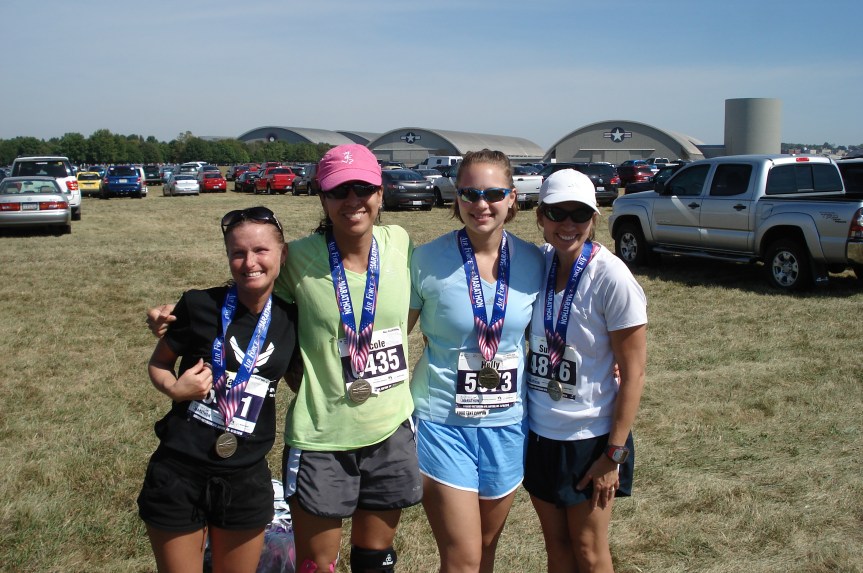 Kathy, Nicole and Susy are all running RIGHT NOW!  Go girls!  This was all of us last September for the Air Force Half Marathon.  I miss my running partners!