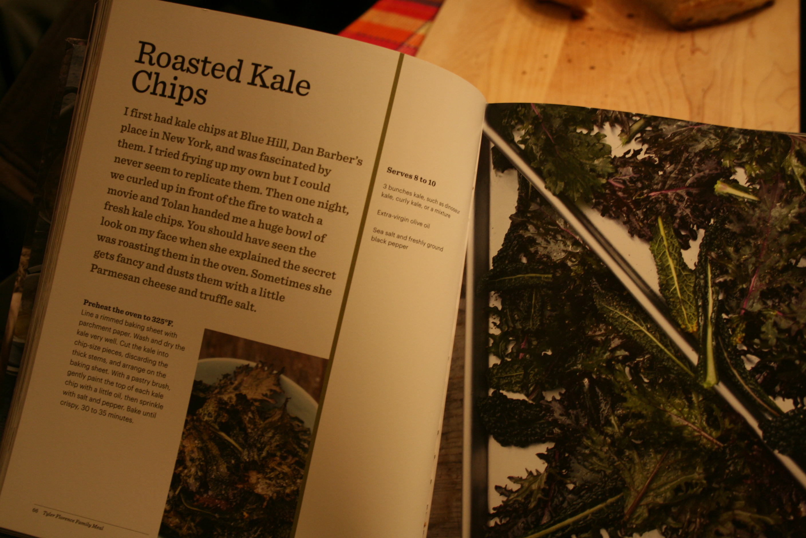 And the kale chips–Kath makes them all the time, and Susy is a big fan, too, so I had to give them a try. Susy gave me Tyler Florence’s Family Meal cookbook (below) and I treasure it. Every time I look at it I think of her. Miss you!