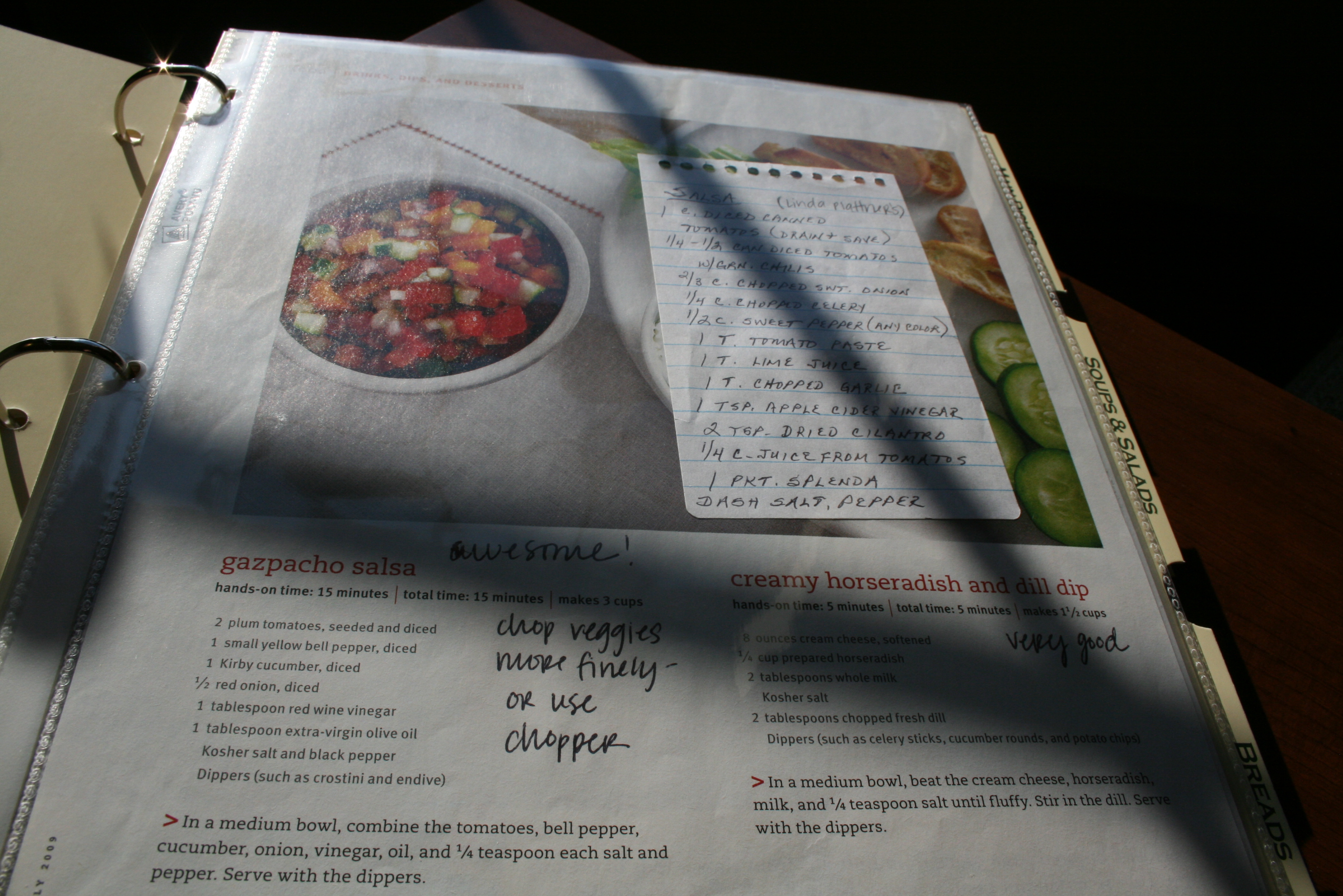 Many of the recipes are magazine clippings (that’s my favorite way to have them–I love the color and pictures) and have my comments written on them. I like to keep like items with like. Above is a gazpacho salsa that was a huge hit at a July 4th party, as well as a tiny notepad paper with my neighbor’s salsa recipe on it. She made it with balsamic vinegar and I thought it was very unique.