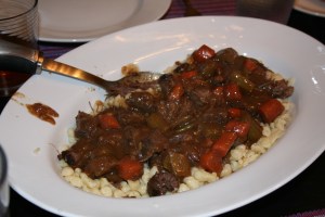 I made sauerbraten and spaetzle Friday night. Andrew and I traveled around Germany a year or so after we got married and have lots of happy memories of the country, the trip and the food. We’re BIG foodies; WHERE we eat on trips is potentially the biggest part, at least for me.