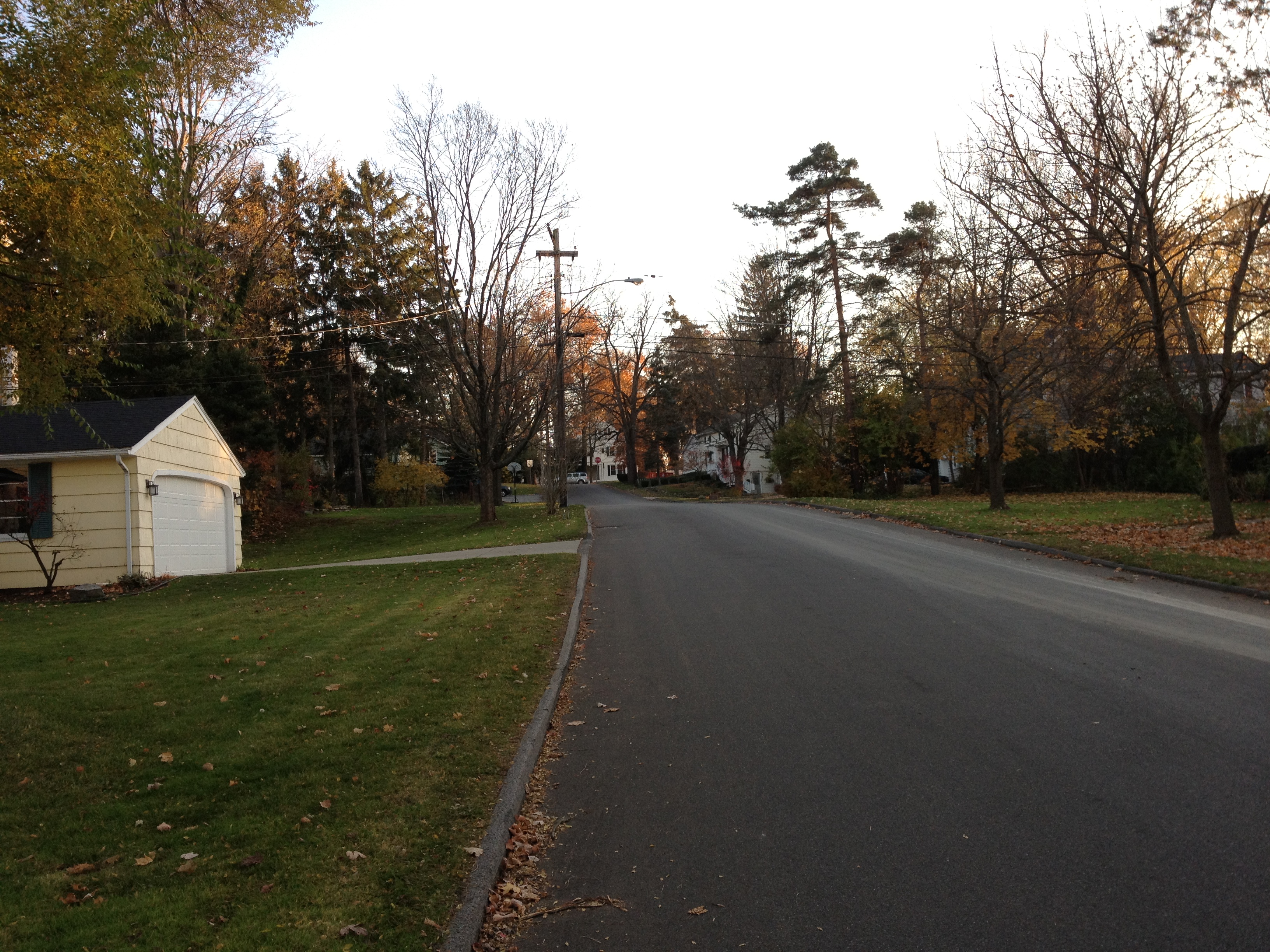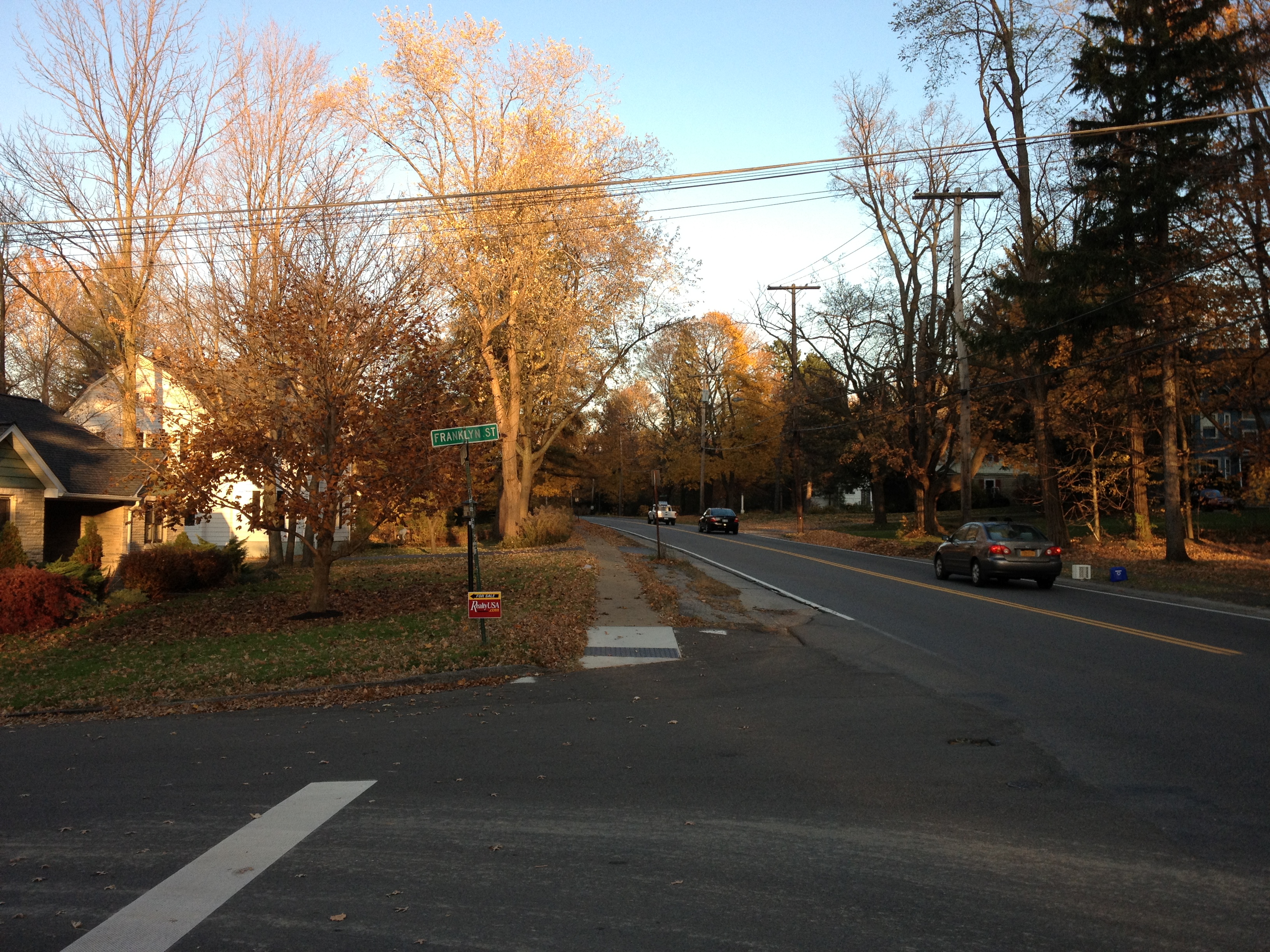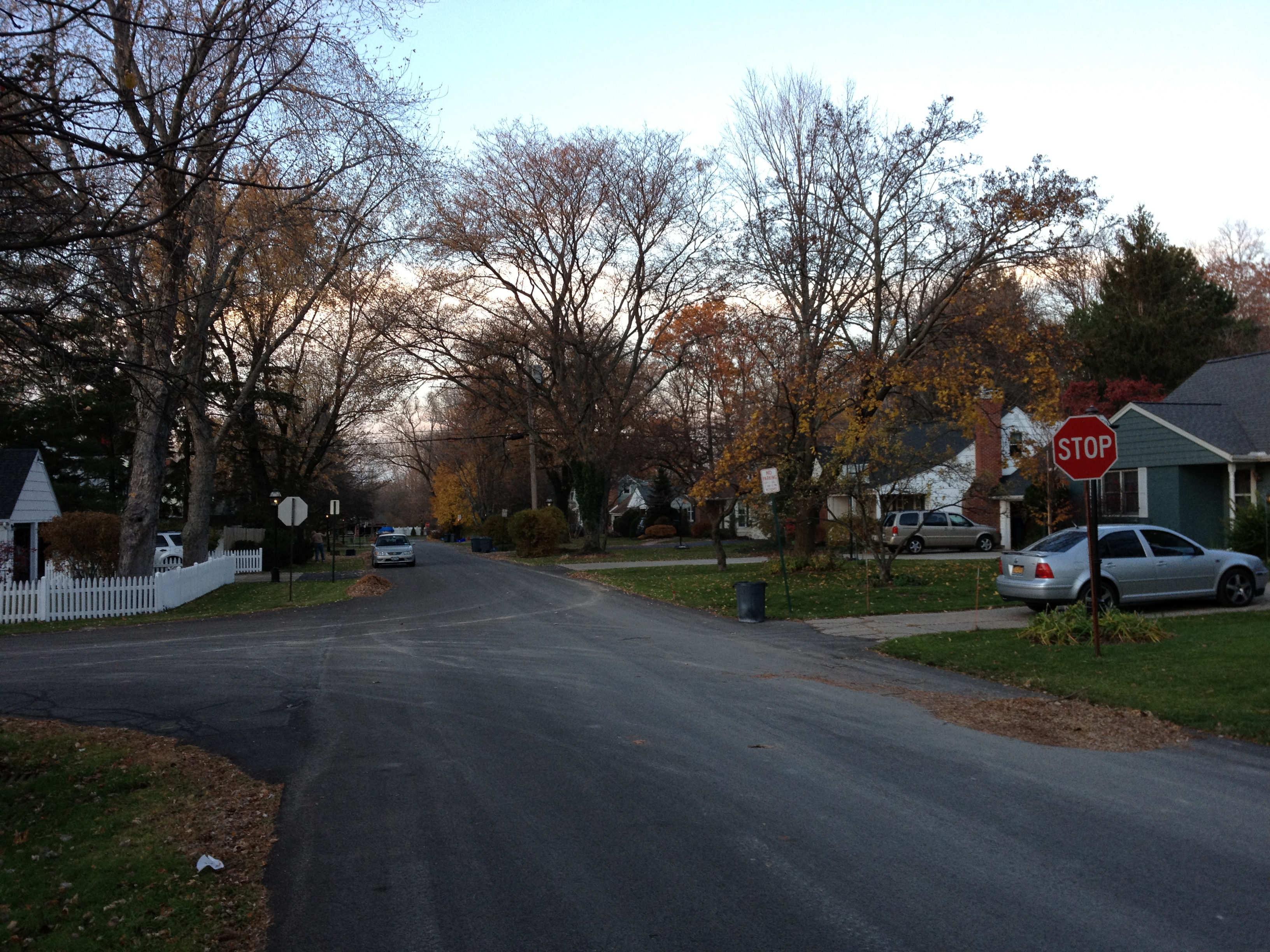 This is the top of our neighborhood where the road meets up with Quaker (a.k.a. 20A) which is the road that takes you to East Aurora. It extends east that way (the way you’re looking, above) and west through Orchard Park and further past the Bills stadium and, eventually, turns into Southwestern Blvd., which is a main thoroughfare here and also the street on which the Y resides.