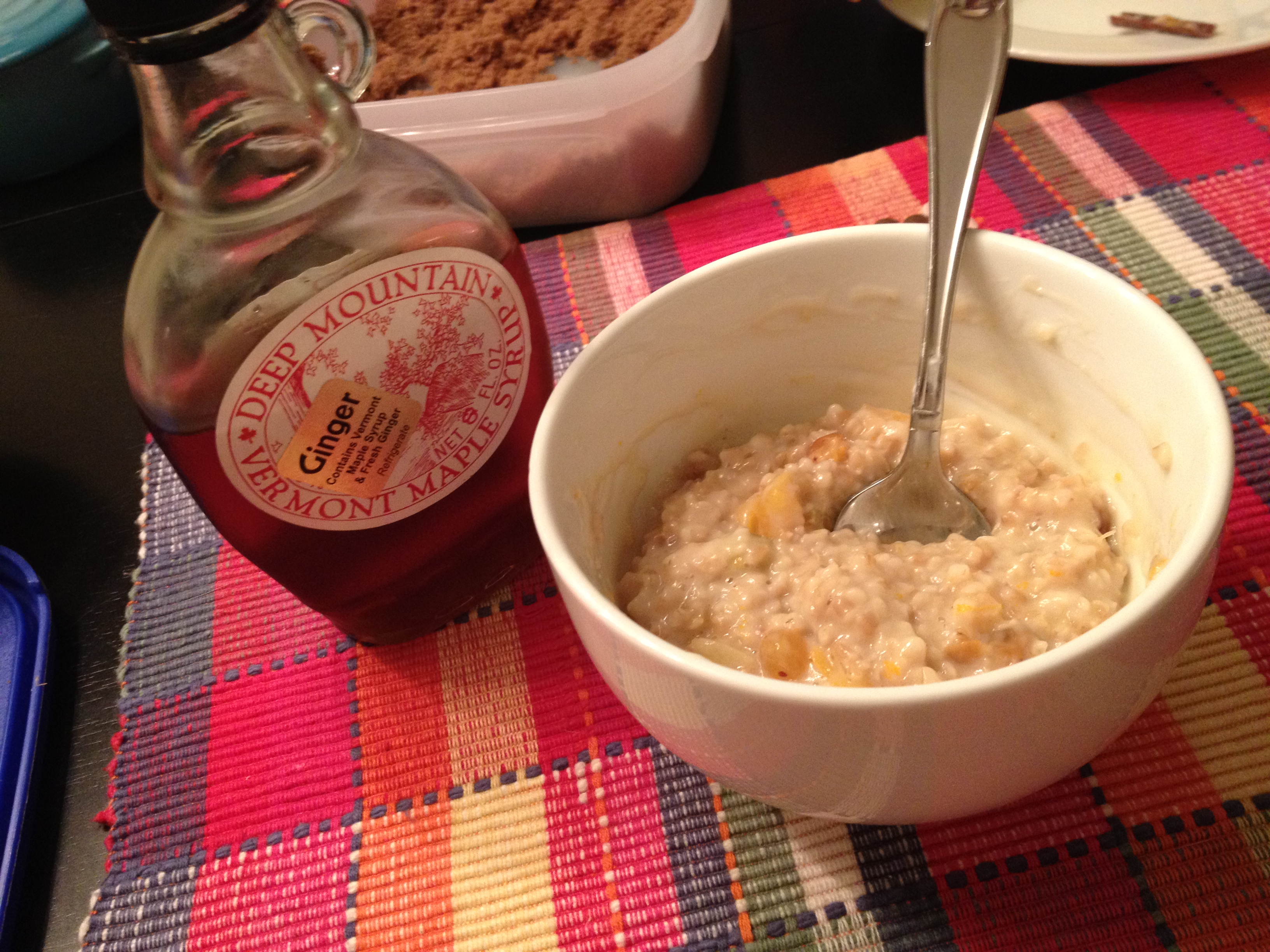 You can see the golden raisins (added last night) and apricots in my bowl. Andrew is more of an oatmeal “purist,” so he wasn’t a huge fan. Not to mention his aversion to apricots in general. Oh well–more for me! Up to this point, there wasn’t any sweetener at all in the oatmeal, so I sprinkled about a teaspoon of brown sugar along with some ginger maple syrup on mine.