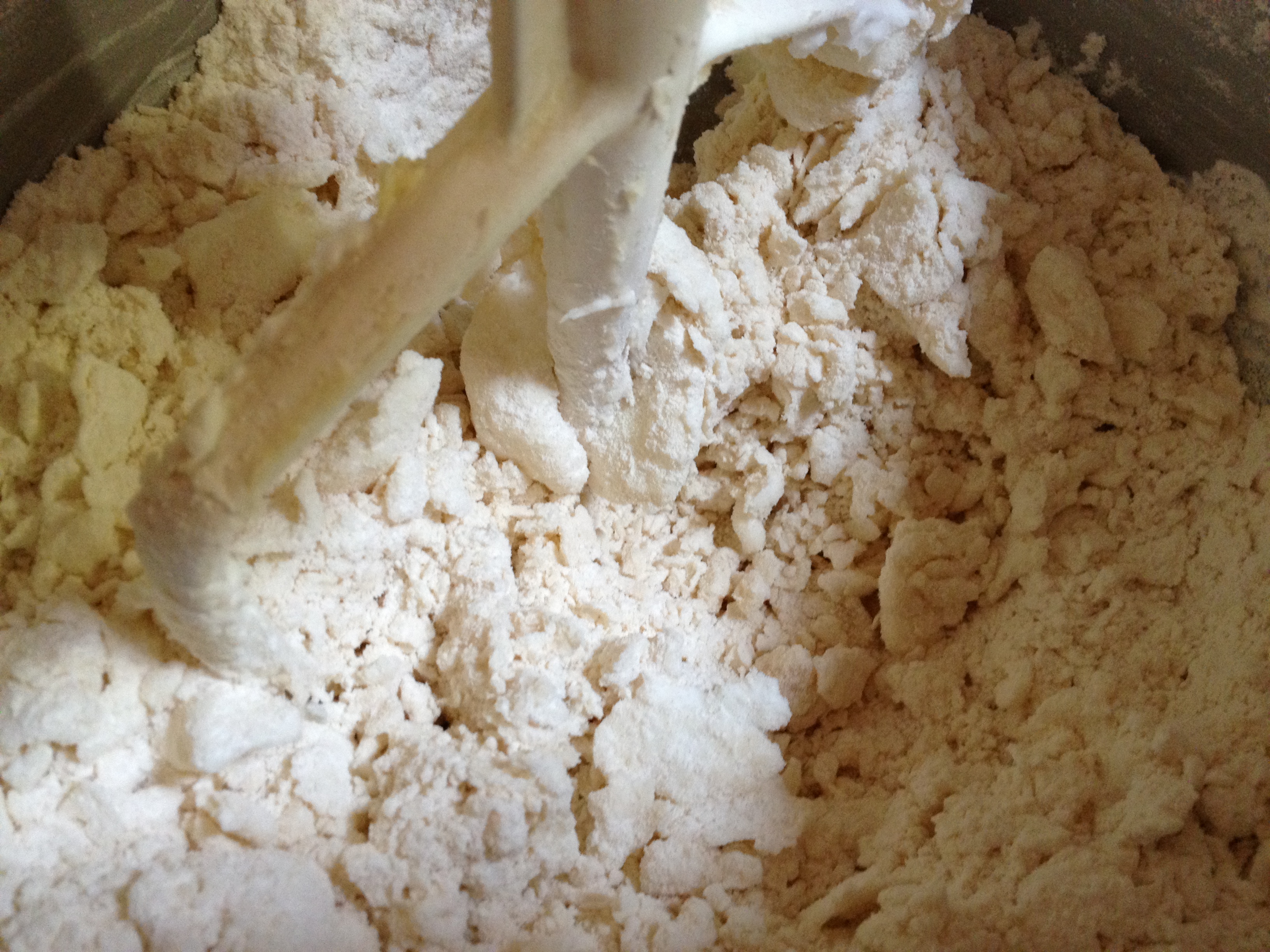 We started with flour, salt and shortening in the mixer until it resembled a pea-like consistency, then started adding water. Mrs. Nye doesn’t bother with the ‘it must be ice-cold’ business!
