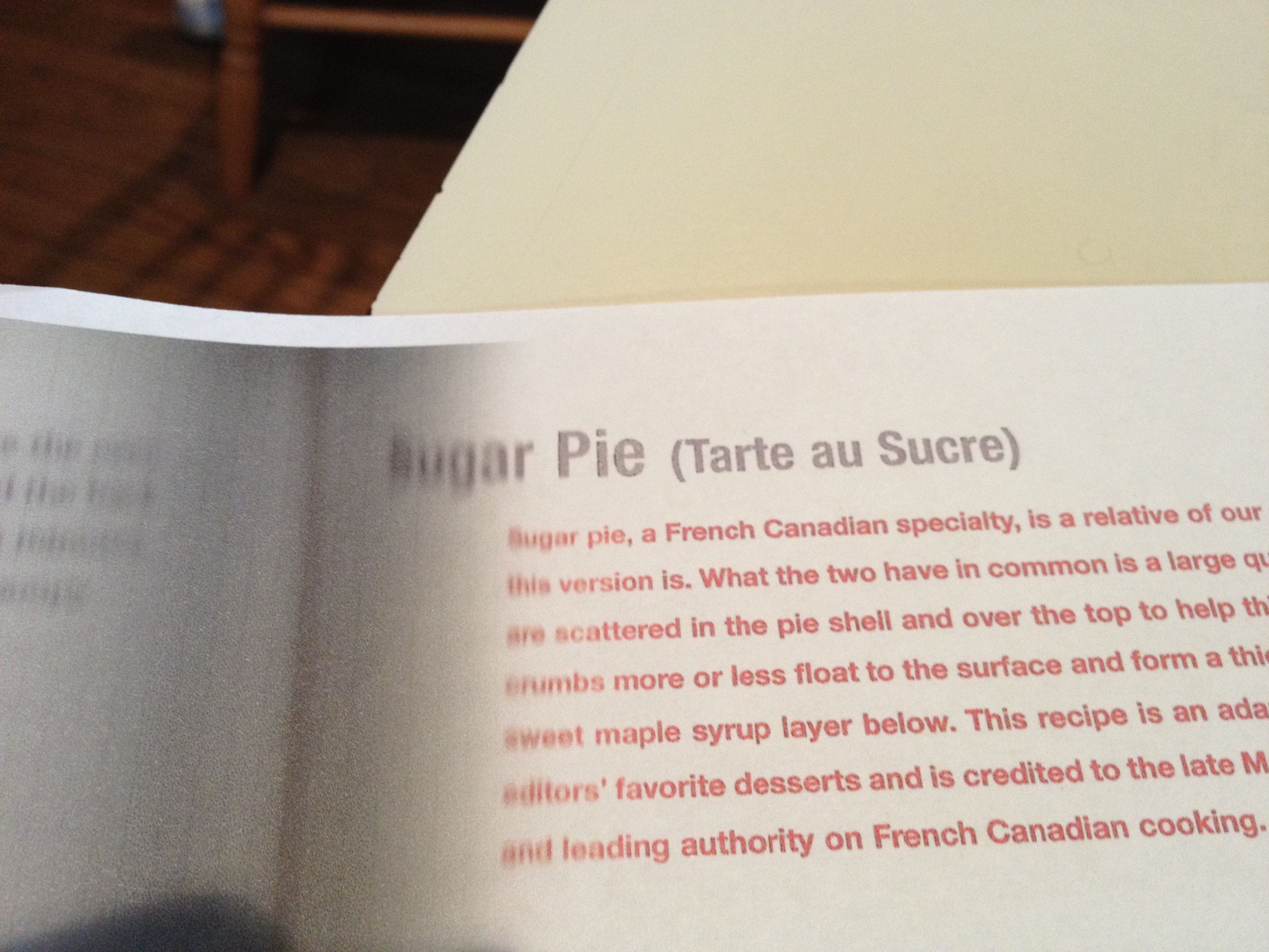 There’s my pie! This one was a maple syrup pie–Andrew and I are huge fans of the one we had at Aux Anciens Canadiens in Quebec City a couple years ago–and I found a recipe in the pie “bible” at Susy’s house. More on the recipe later.