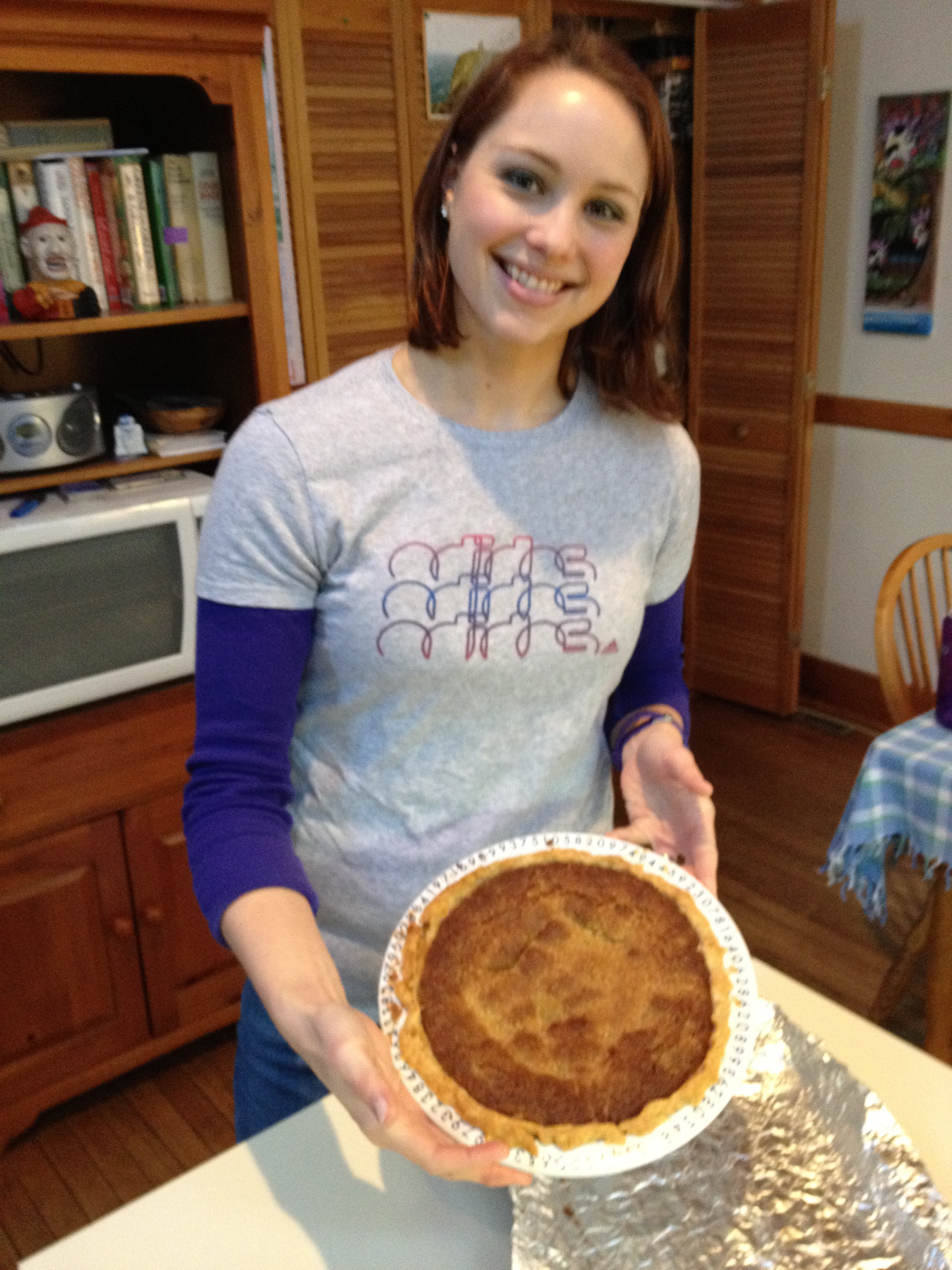 Below is me with the baked maple syrup pie. Man, did it smell good! I had to scoot out after it finished, we I took it home to surprise Andrew, and then we showed up at the Nye’s with the rest of the pie to share with them.