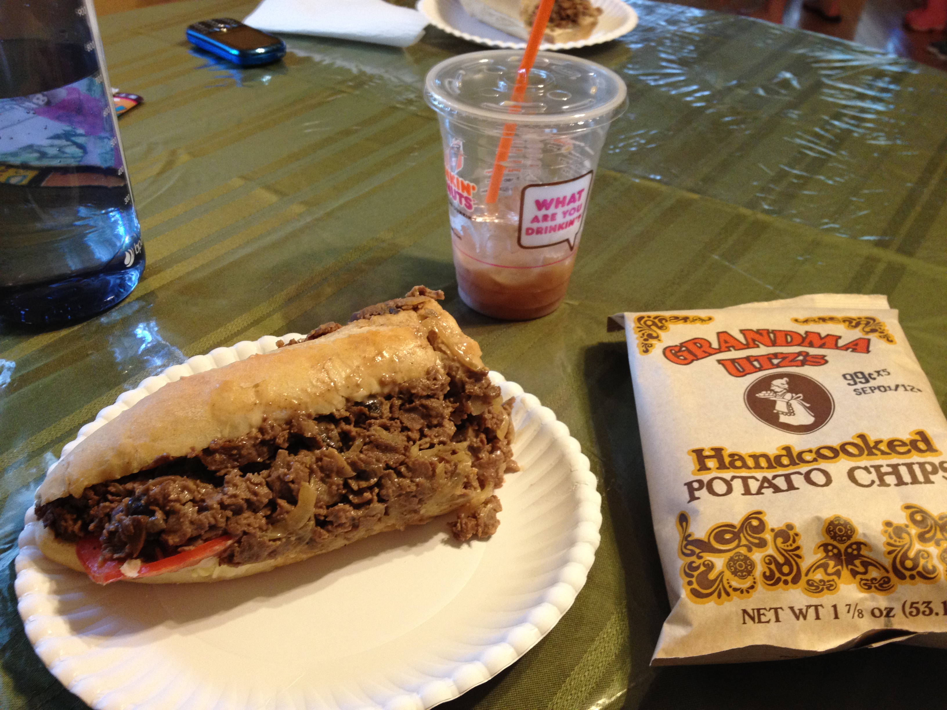 They make their own bread and their cheesesteaks are to die for. No kidding. Mommy and I split a cheesesteak hoagie (add mayo, lettuce and tomato) with sauteed onions and mushrooms. Hey, no one said it was healthy. And Grandma Utz’s handcooked chips–seriously good.