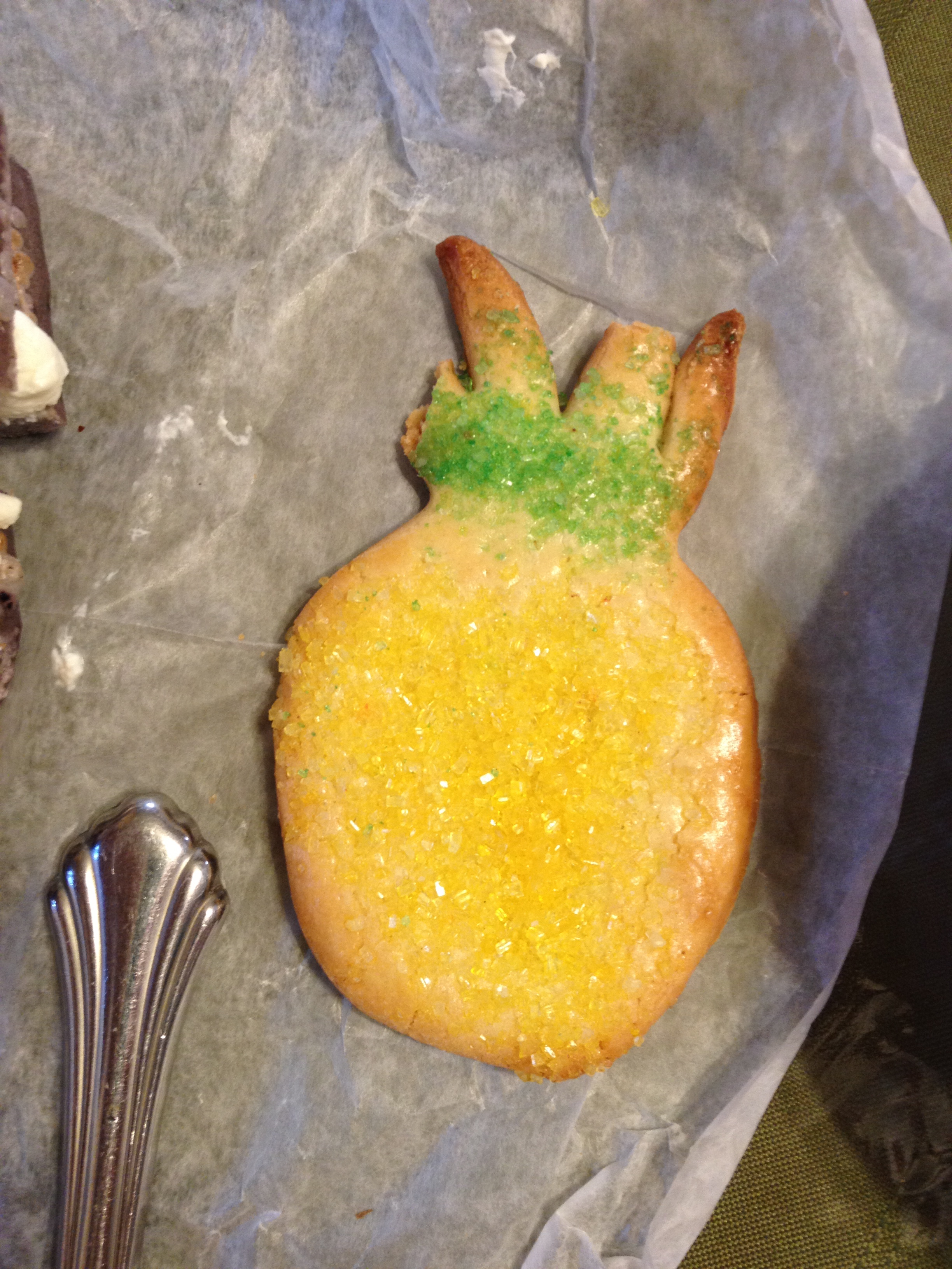 I walked to the bakery earlier in the morning and look what I found! A pineapple-shaped cookie! I got one for mommy for her plane ride home.