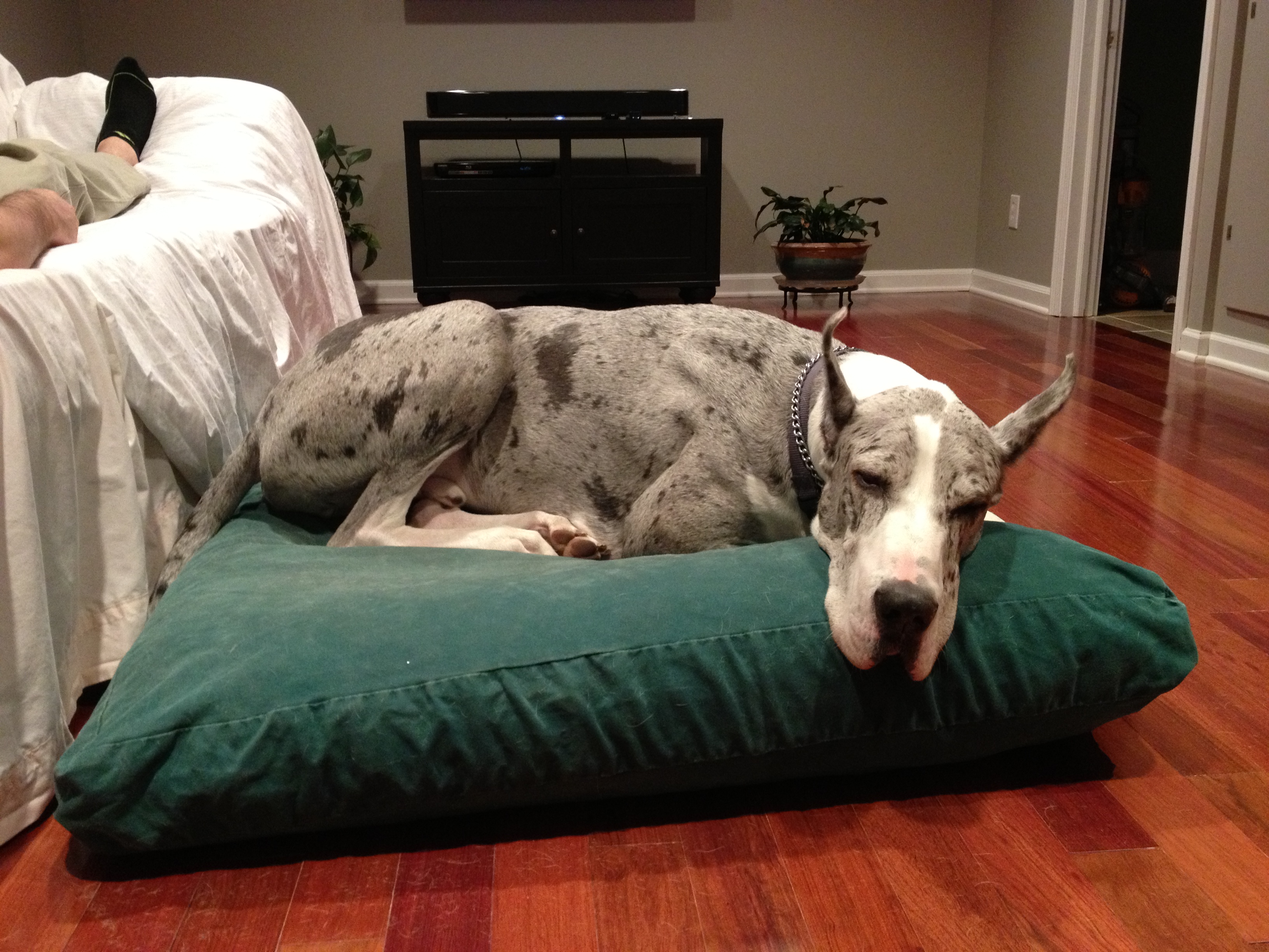The poor guy’s been sleeping on it almost completely flat for awhile now. We just use packing peanuts from the UPS store. You’d be amazed how they flatten over time…