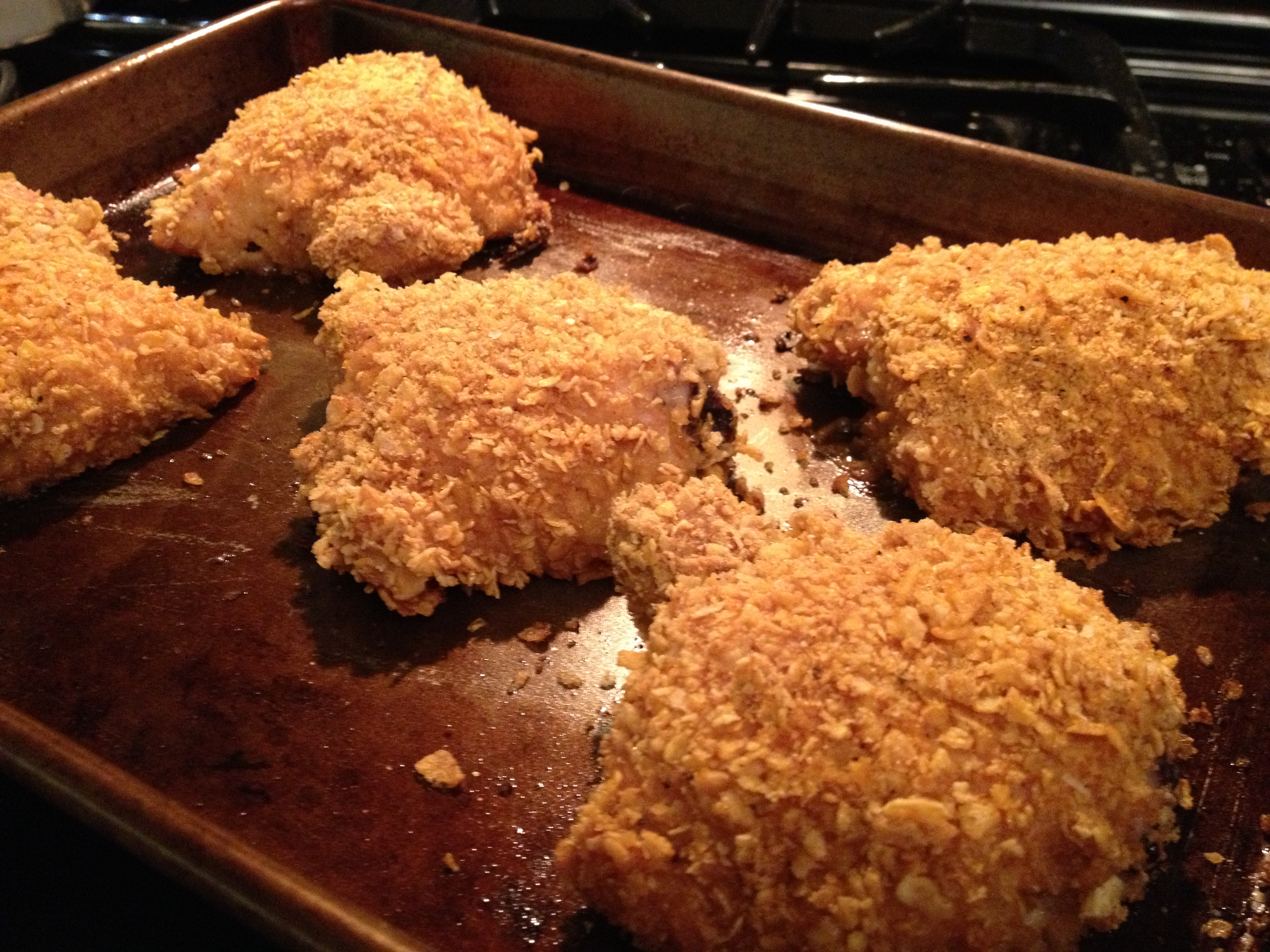 A few nights later, I tackled Ellie’s oven-fried version. It relied on a buttermilk soak for tenderness, bone-in, skinless thighs for moisture and a bit of sweetness from honey. The “breading” was a heavily seasoned cornflake cereal mixture.
