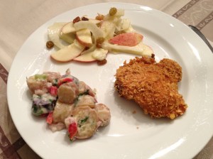 I served it with two cold salads: a potato salad and an apple, fennel and golden raisin salad similar to one I get at Wegmans a lot.