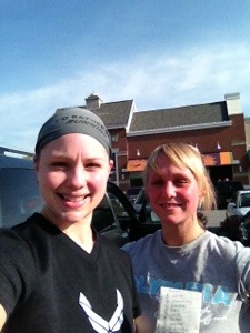 We look a little worse for the wear–it got pretty warm out there–but we did it! Stephanie said she wanted to try some more milage, so I mapped a 7.75 mile course (note the piece of paper I’m holding up) all over Orchard Park, and did three miles before she arrived.