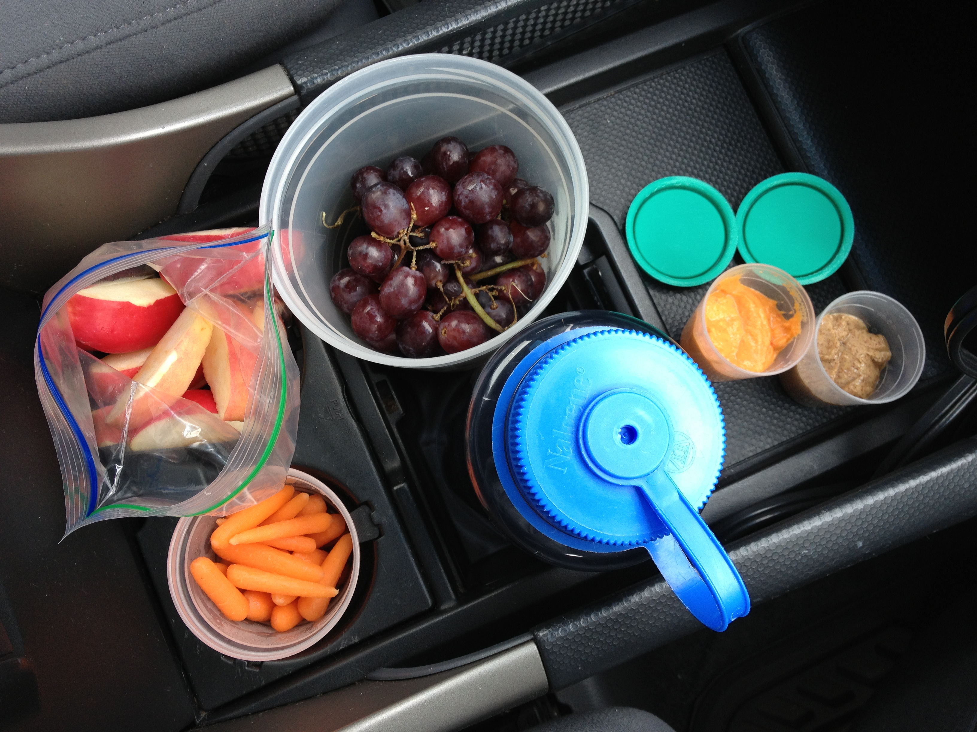 Holly’s in-car lunch: apples, almond butter, grapes, hummus and carrot sticks.