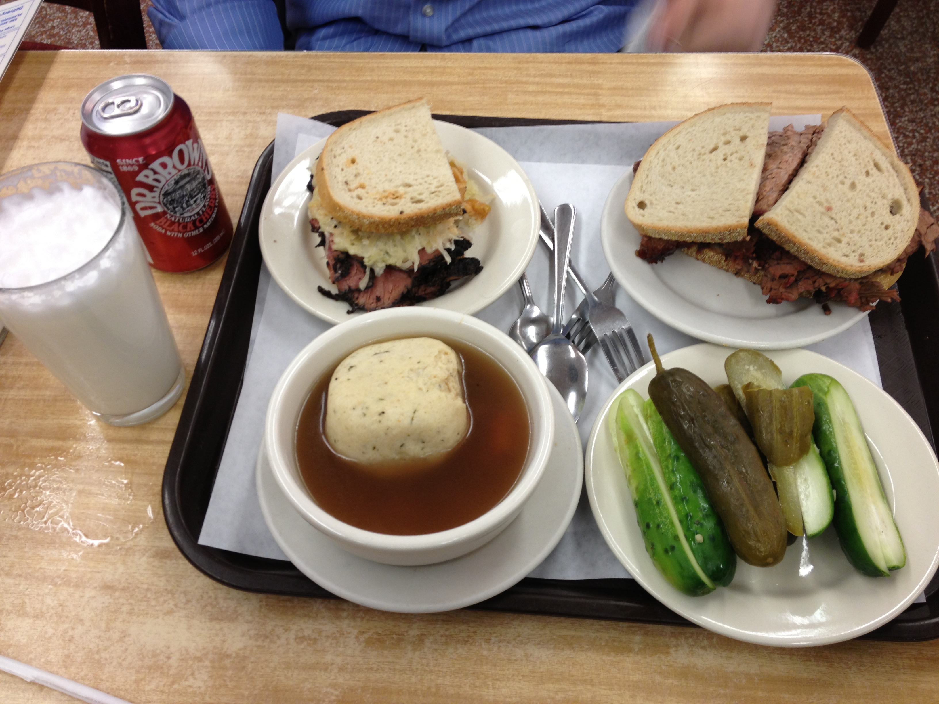 The menu features all sorts of meats on rye, such as brisket or pastrami, as well as matzo ball and split-pea soups. You order at the counter at the appropriate station (drinks, sides and sandwiches all have their own place) and hand the staff member filling your order the ticket you were given when you entered. They mark the price and hand it back to you.