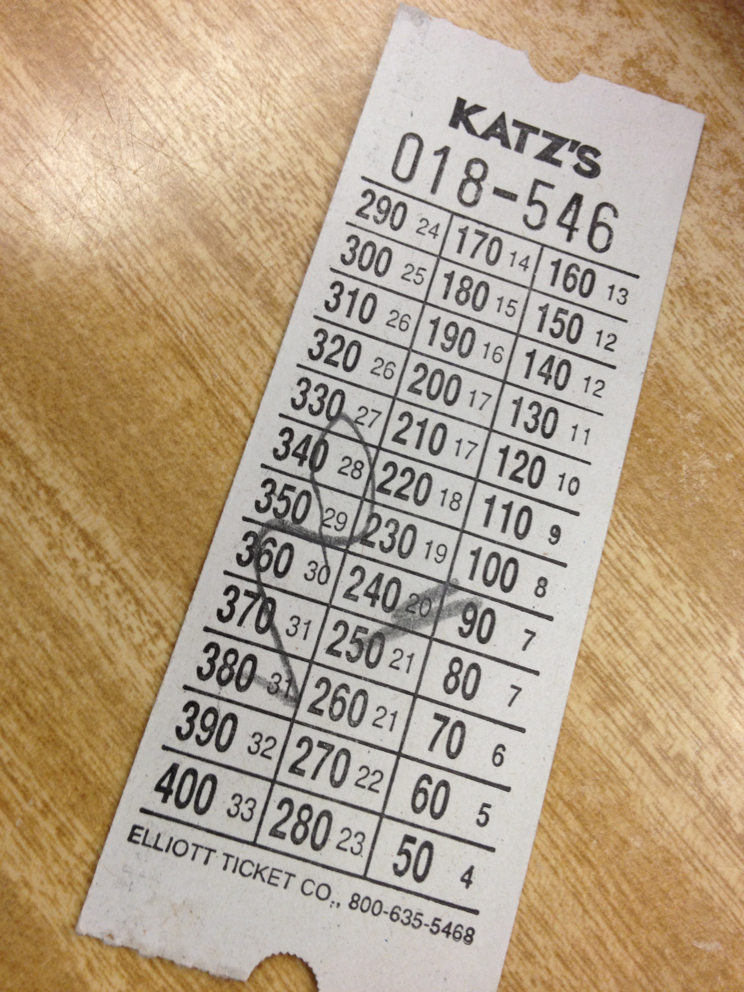 Shortly after arriving, arranging for the car to be parked and tipping the bellhop who brought us our bags, we headed out for dinner via the subway. Andrew had, in true Andrew-fashion, written up a minute-by-minute itinerary of our trip. I love that man. Thursday night’s dinner: perhaps the most famous Jewish deli in all of NYC, Katz’s Delicatessen in the East Village.