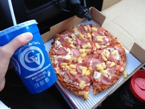 We arrived just around dinnertime, and after saying good he to my other half, I did what exactly what Andrew would have done if our roles were reversed: I ordered a pizza. Except that mine was the kind topped with ham and pineapple…something strangely hard to find here in WNY. No one, and I mean NO ONE sells Hawaiian pizzas around here. It’s been (slightly) rough.