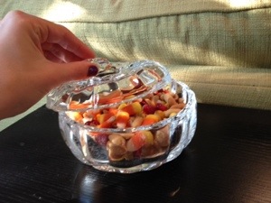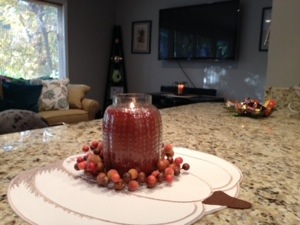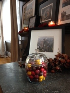 In two nights, I broke down a ton of ransom cardboard boxes, painted the tops of a desk and matching shelf, cleaned like mad and went in a crazy mission to find a glass pumpkin-shaped candy dish. (BTW, way harder to find than I thought it would be.)