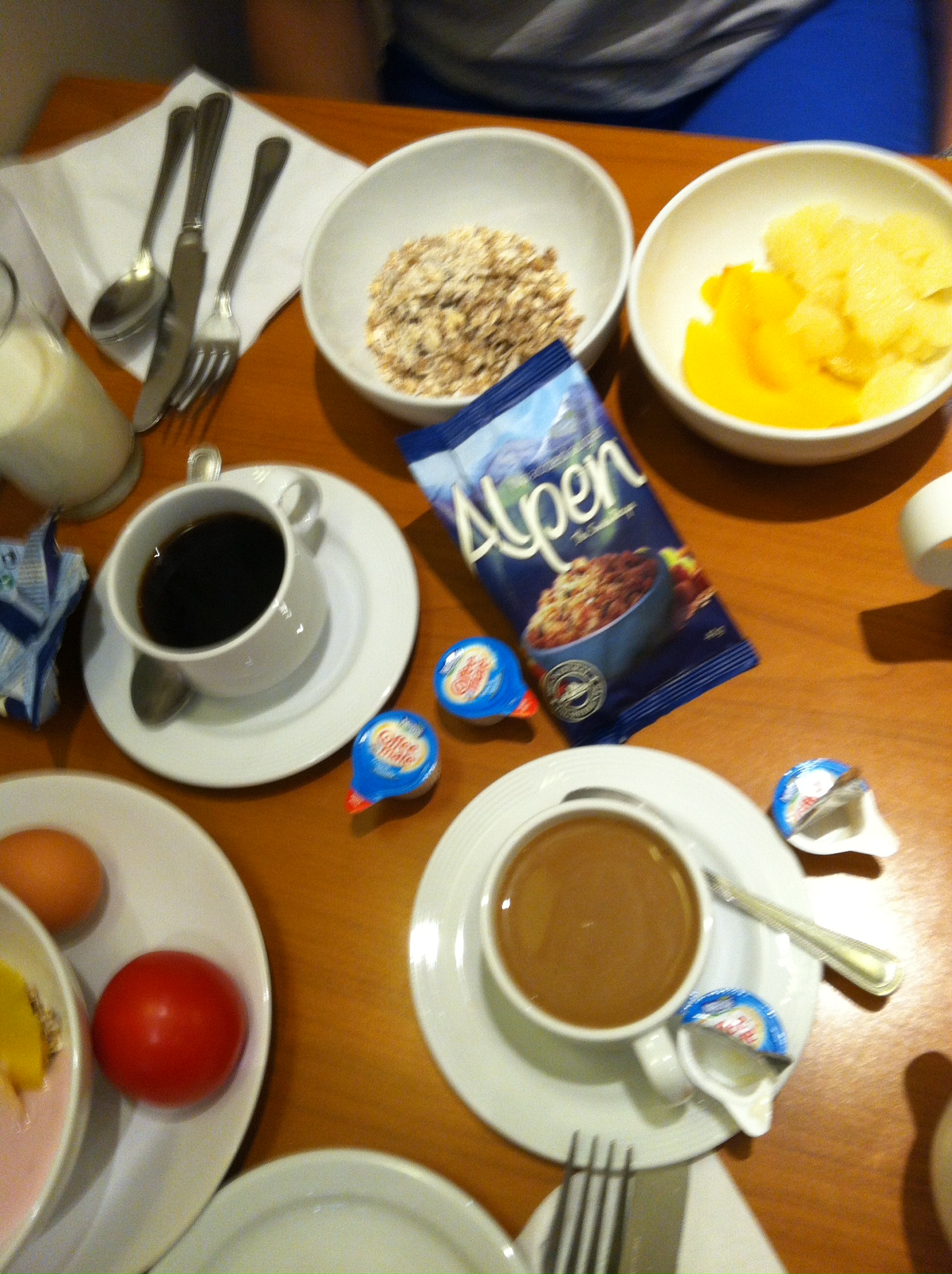 I slept until 8 a.m. the next day (10 hours of sleep–unheard of!), and we enjoyed the breakfast in our hotel. If only I could find REAL muesli here… Each morning, mom and I enjoyed cereal, yogurt and toast with ham, cheese, hard-boiled egg and tomato. Mom brings her little International (haha) Delight coffee creamers wherever she goes…