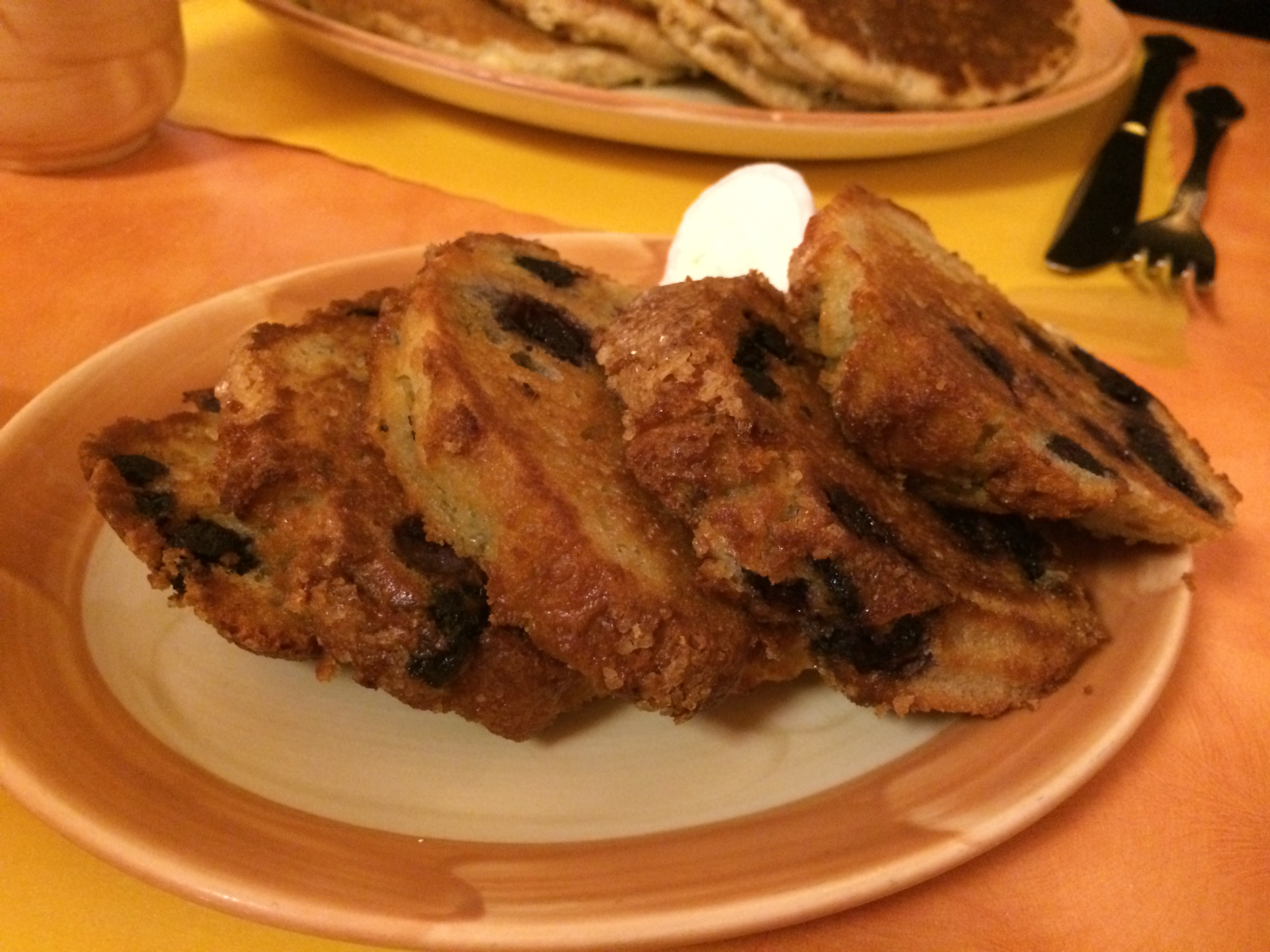 Note the piece of cinnamon swirl bread behind my plate…it was grilled and topped with a gooey cinnamon roll icing-like sauce. YUM. Andrew and I polished that off easily.
