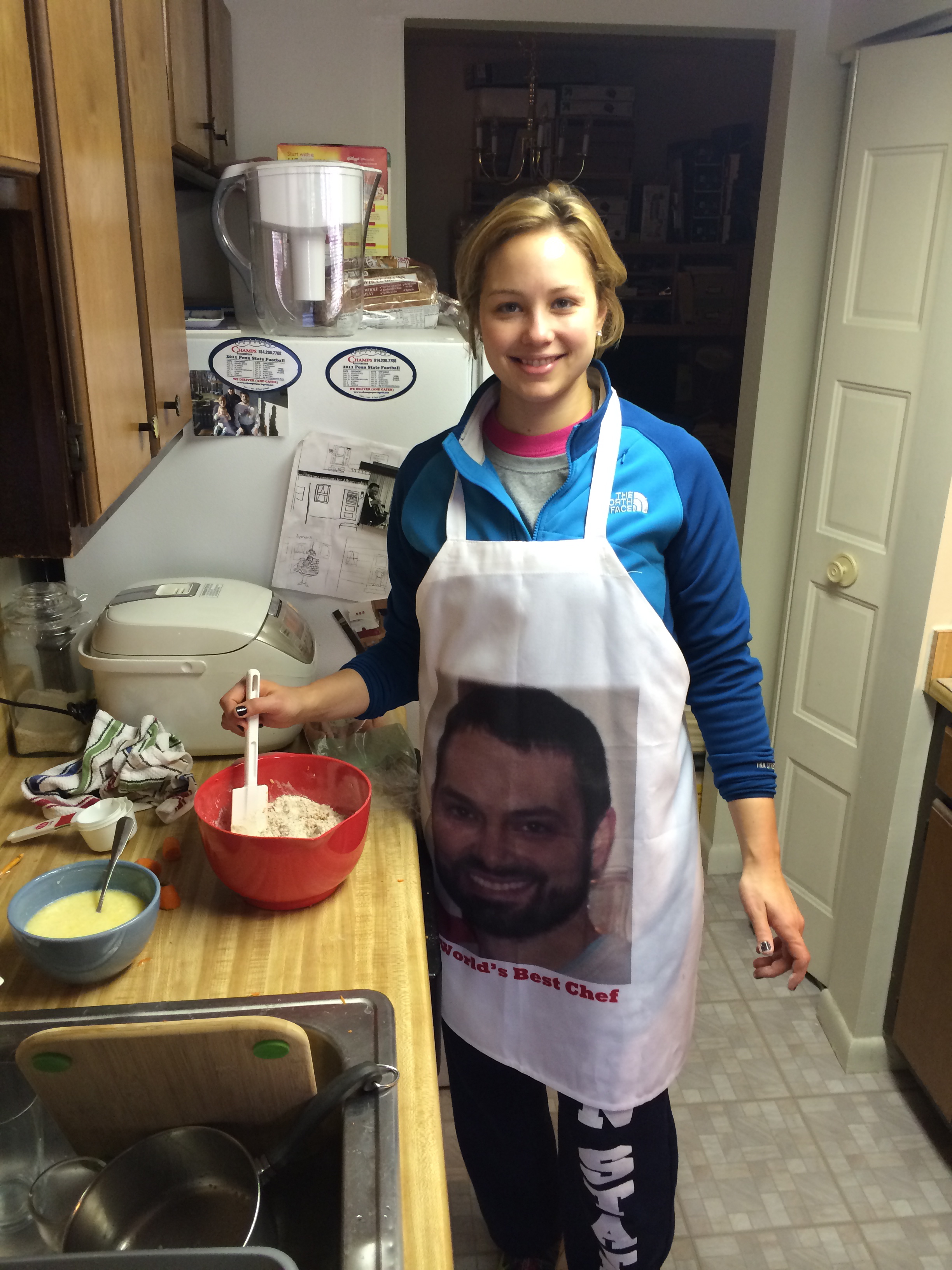 I even brought my own apron–the Andrew apron–that Adam gave me a while ago. He tends to do funny things with photos of Andrew…there are two blankets and mug as well!