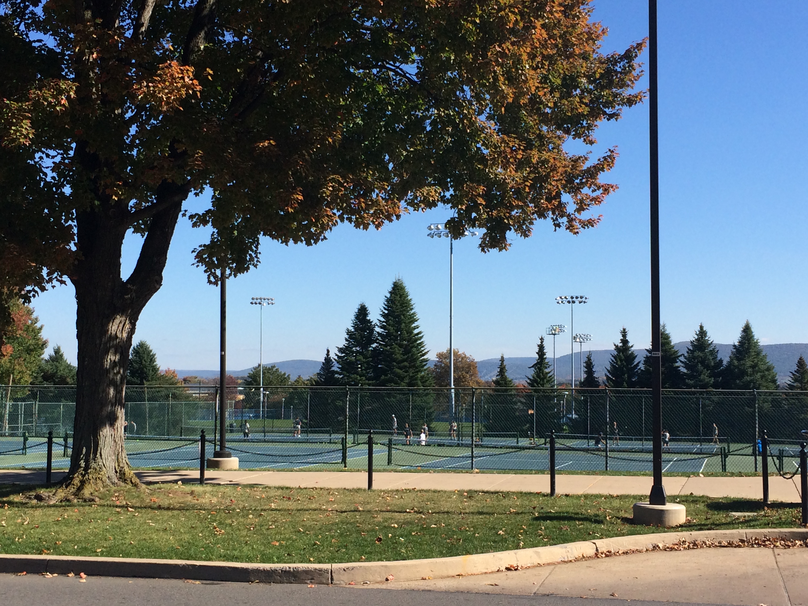 View from East Halls over the tennis courts with Mount Nittany in the background:
